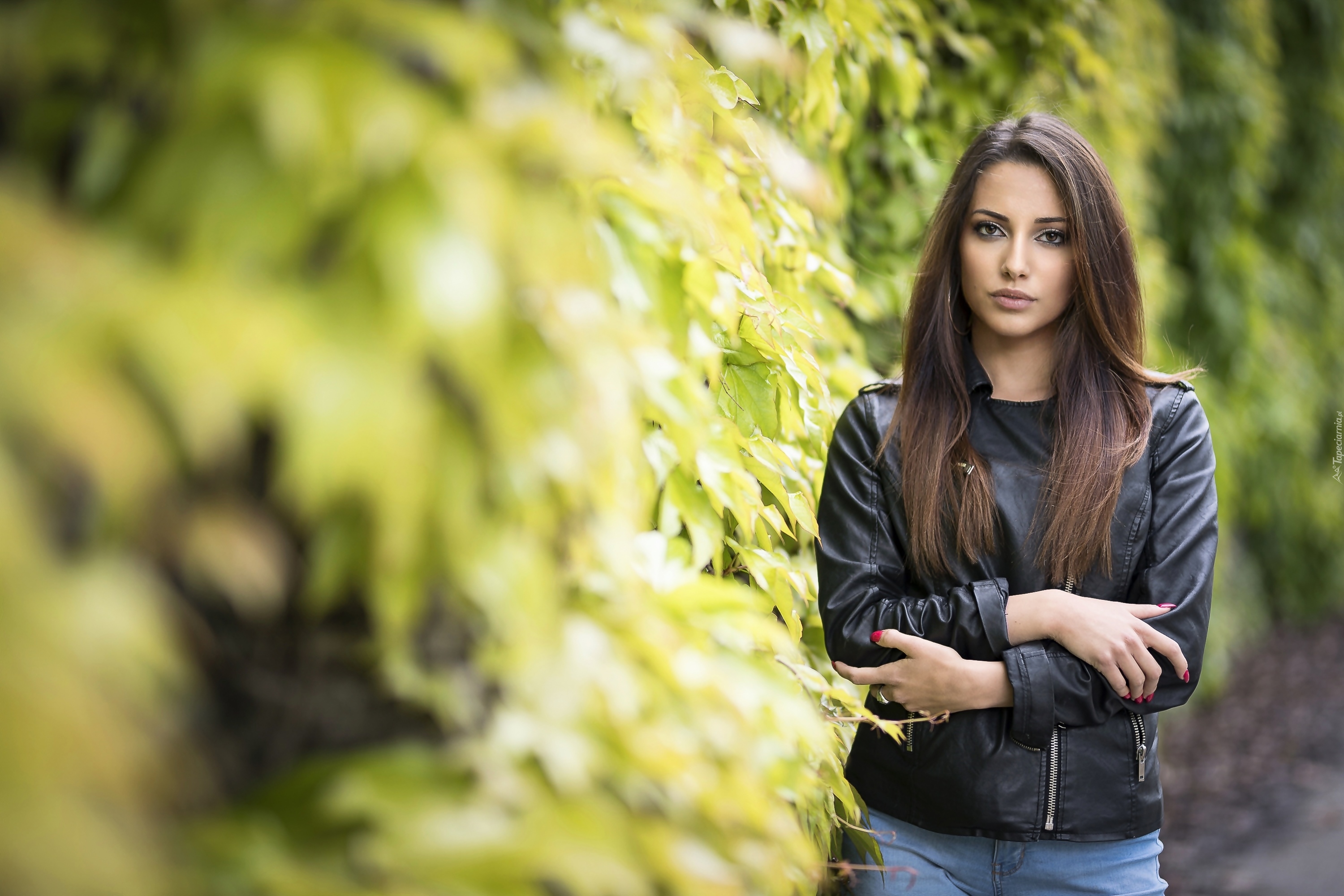 Edytor tapety: Długowłosa szatynka w skórzanej kurtce