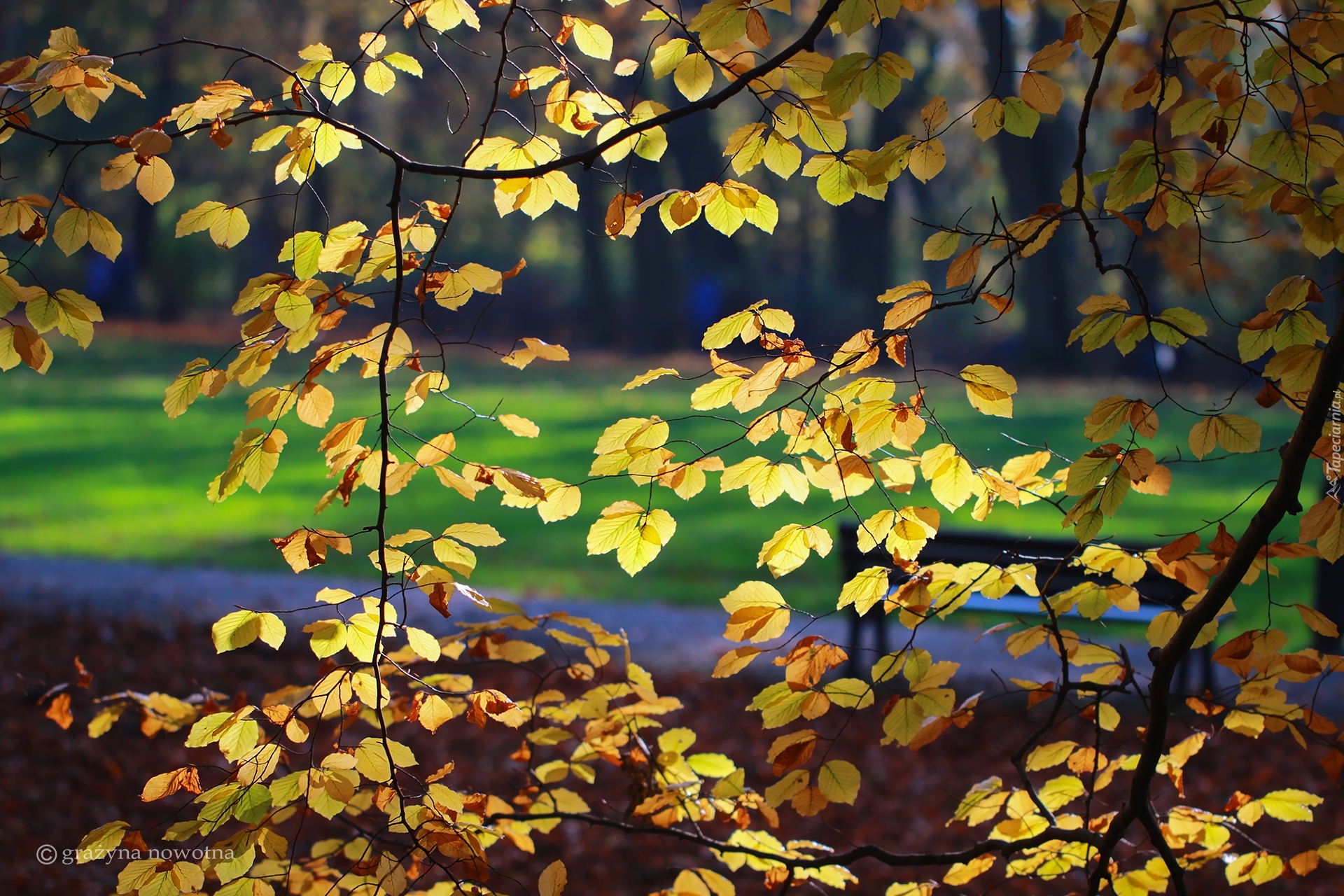 Edytor tapety: Żółte jesienne liście na gałązkach w parku