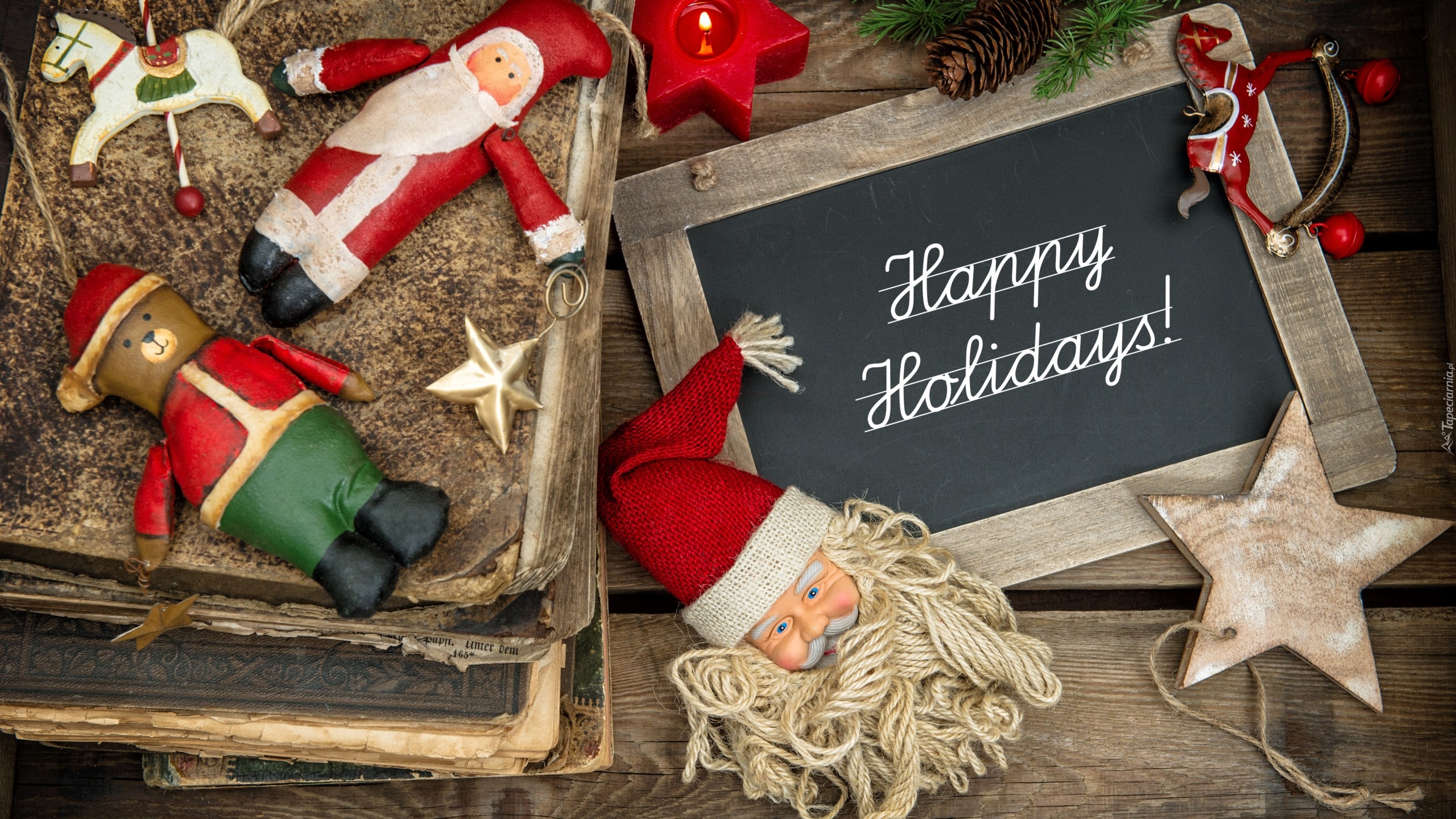 Edytor tapety: Zabawki obok tablicy z napisem Happy Holidays