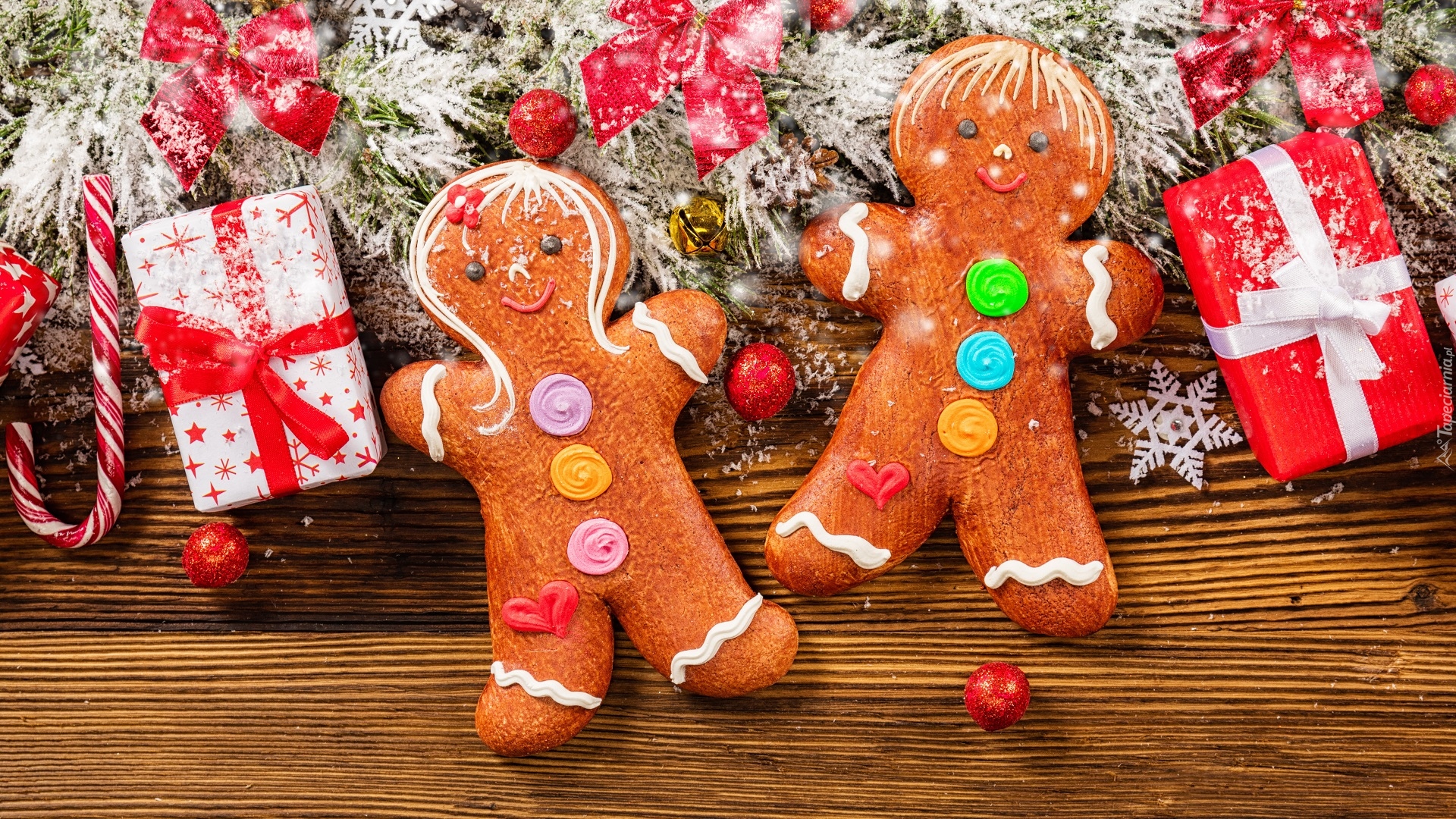 Edytor tapety: Piernikowe ludziki obok prezentów na deskach