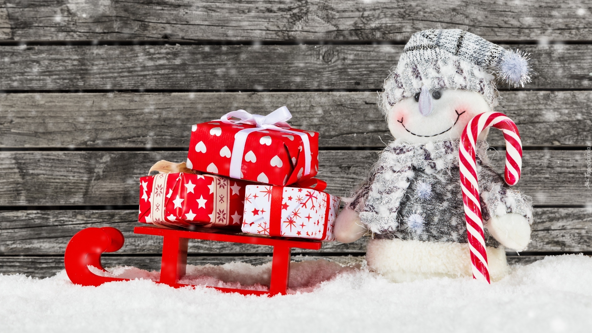 Edytor tapety: Wesoły bałwanek obok sanek z prezentami