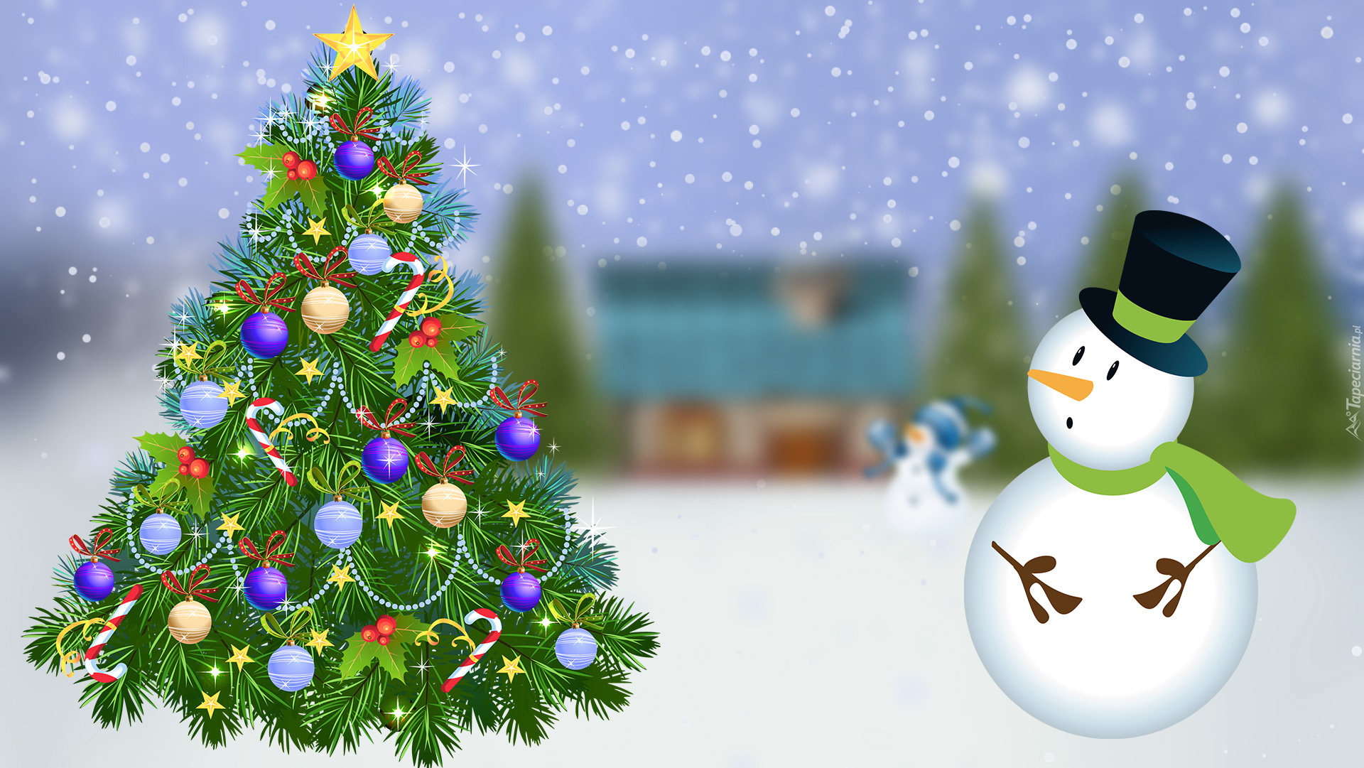 Edytor tapety: Zdziwiony bałwanek patrzący na choinkę