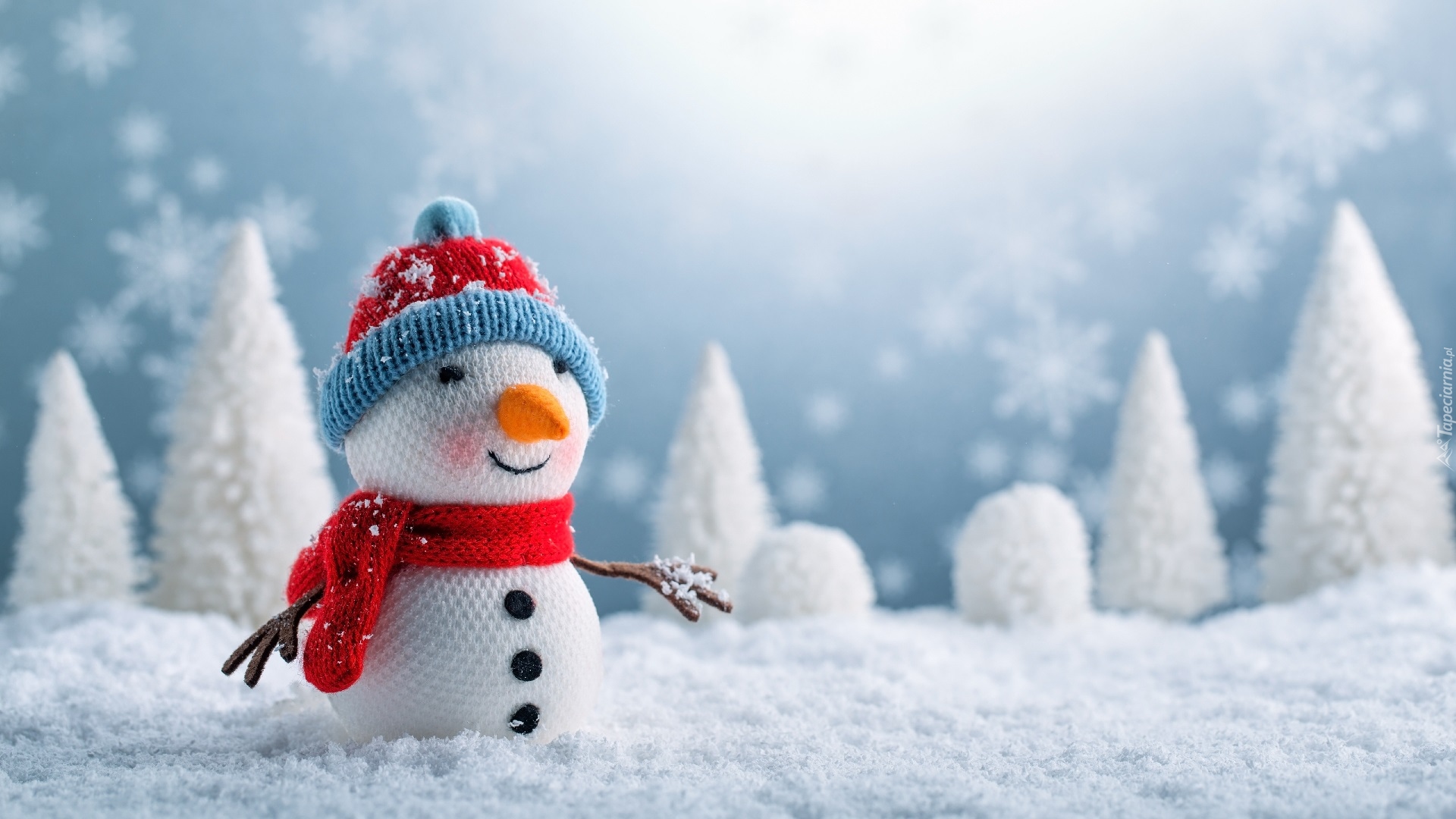 Edytor tapety: Bałwanek w czapce i szaliku na śniegu