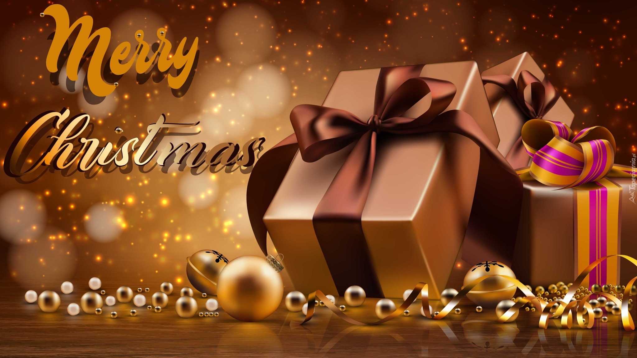 Edytor tapety: Prezenty przewiązane wstążkami obok ozdób świątecznych