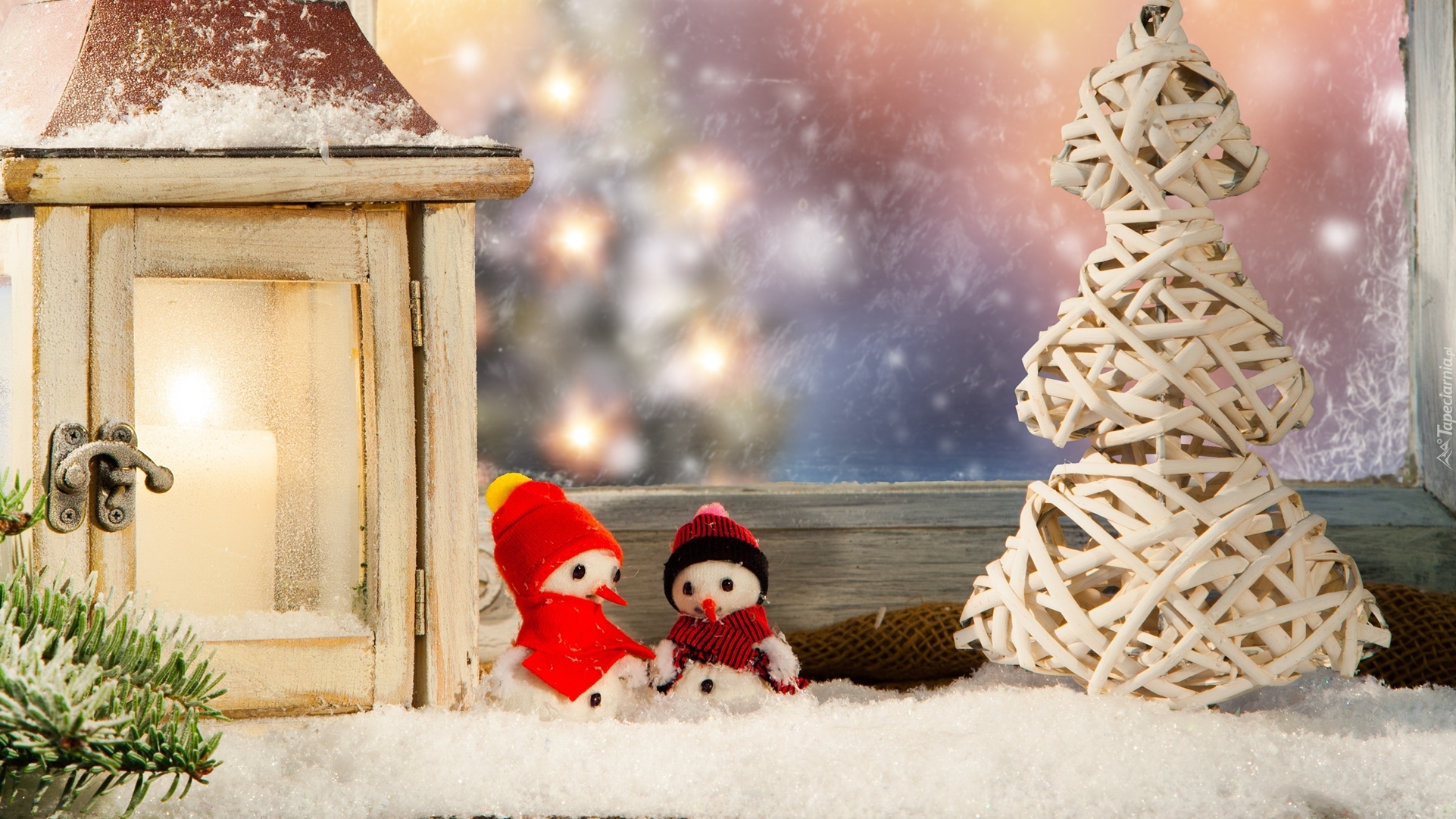 Edytor tapety: Bałwanki w czapkach obok lampionu i choinki