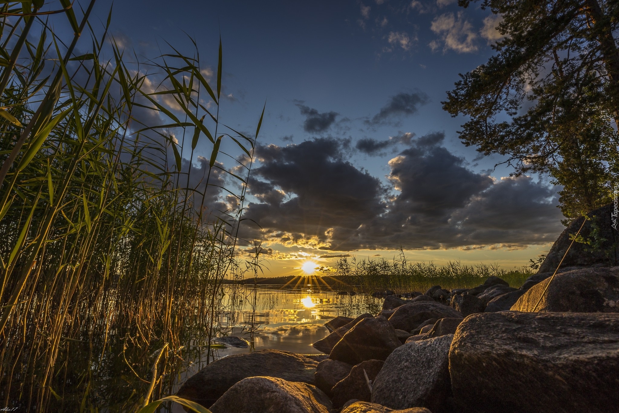 Edytor tapety: Wschód słońca nad jeziorem porośniętym trzcinami