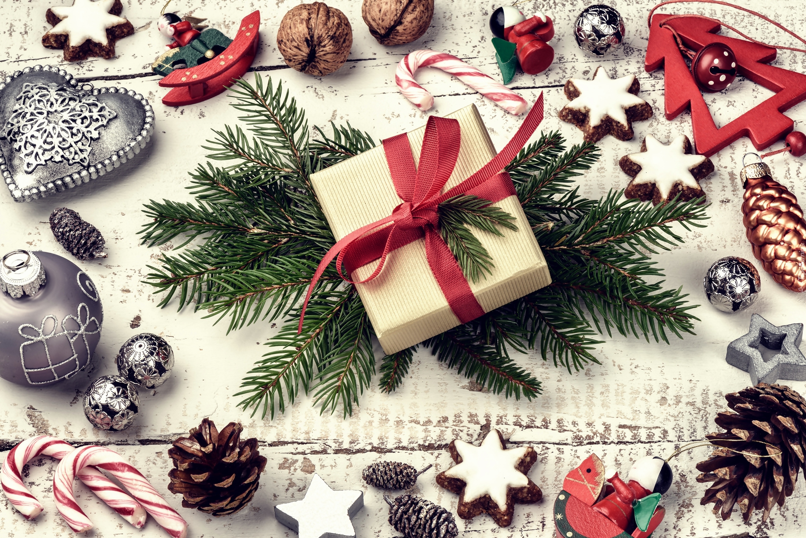 Edytor tapety: Prezent na gałązkach wśród świątecznych ozdób