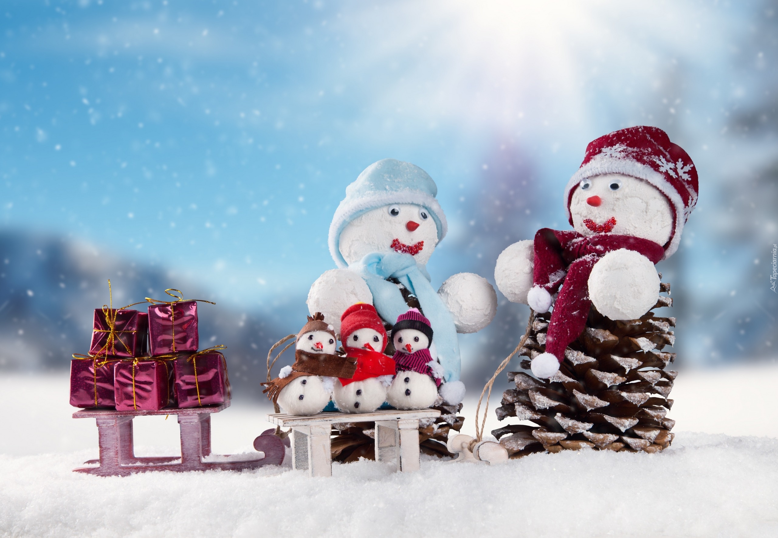 Edytor tapety: Bałwanki na śniegu z sankami i prezentami