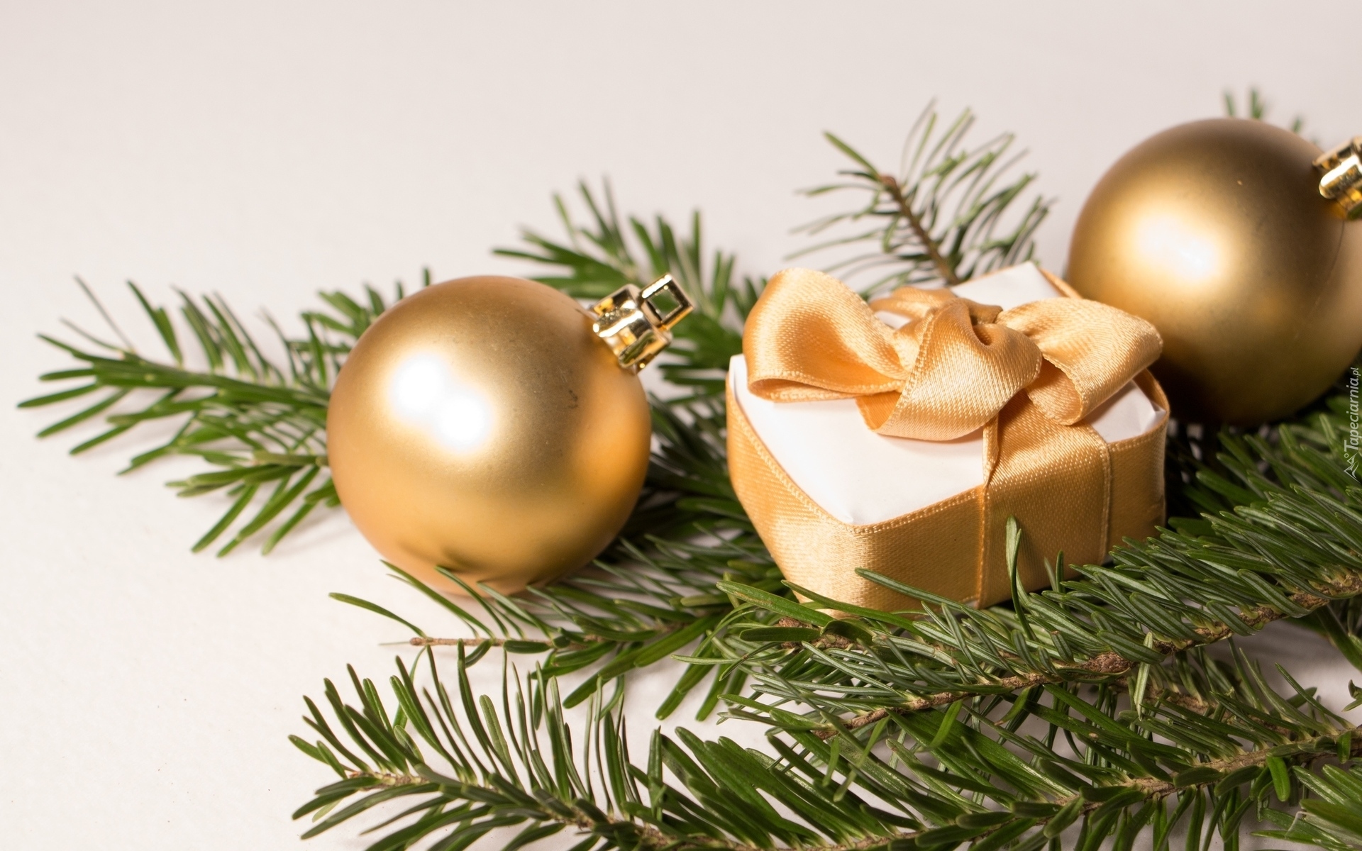 Edytor tapety: Prezent i bombki położone na świerkowej gałązce