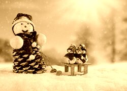 Edytor tapety: Małe bałwanki na sankach i duży szyszkowy bałwan