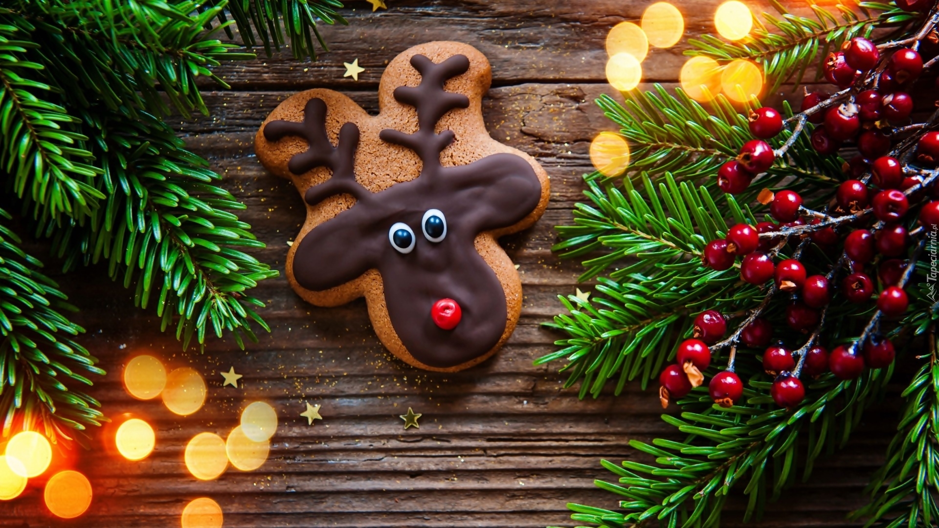 Edytor tapety: Ciasteczkowy renifer na deskach obok gałązek świerku