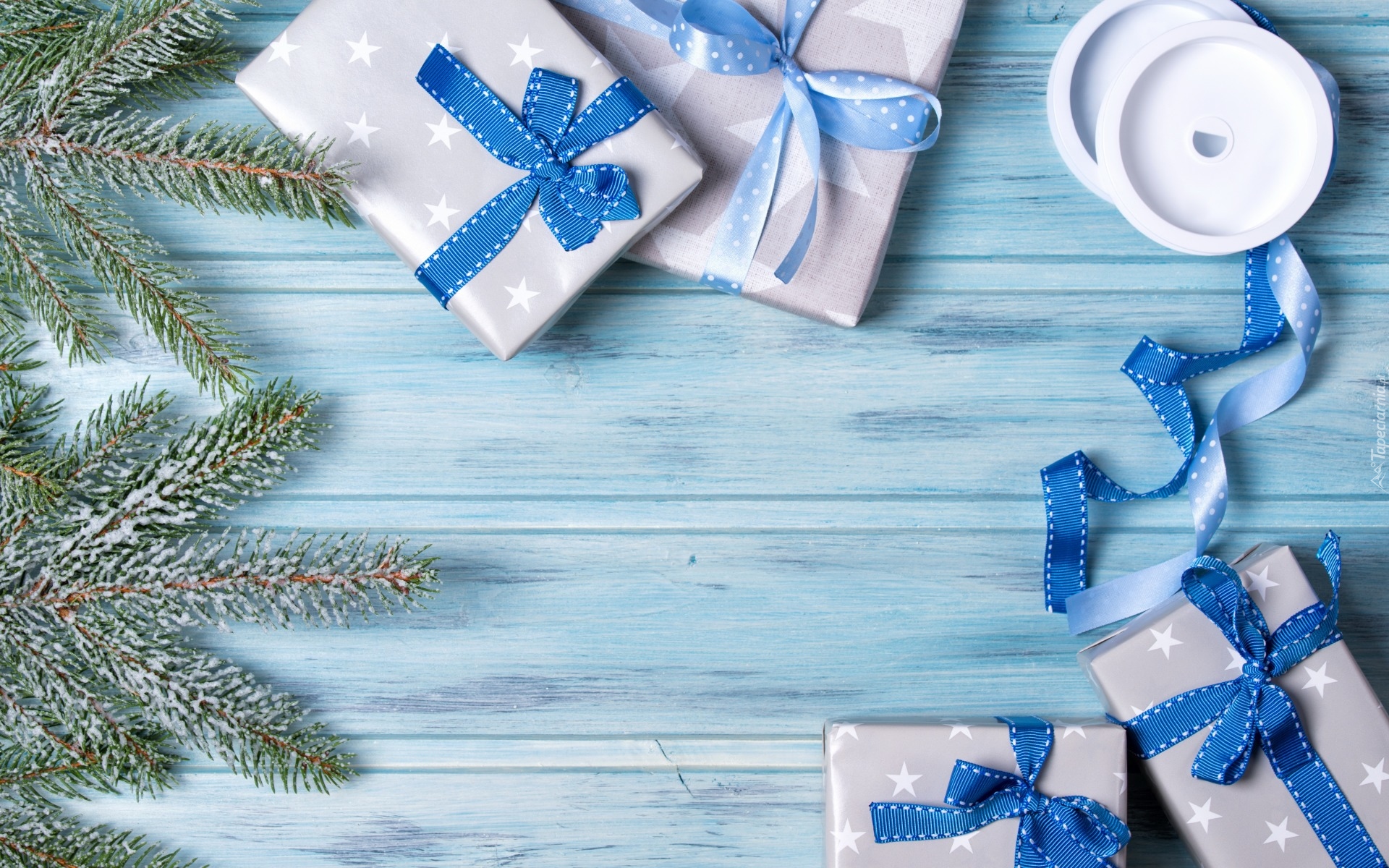 Edytor tapety: Prezenty z niebieską wstążką przy gałązkach świerku