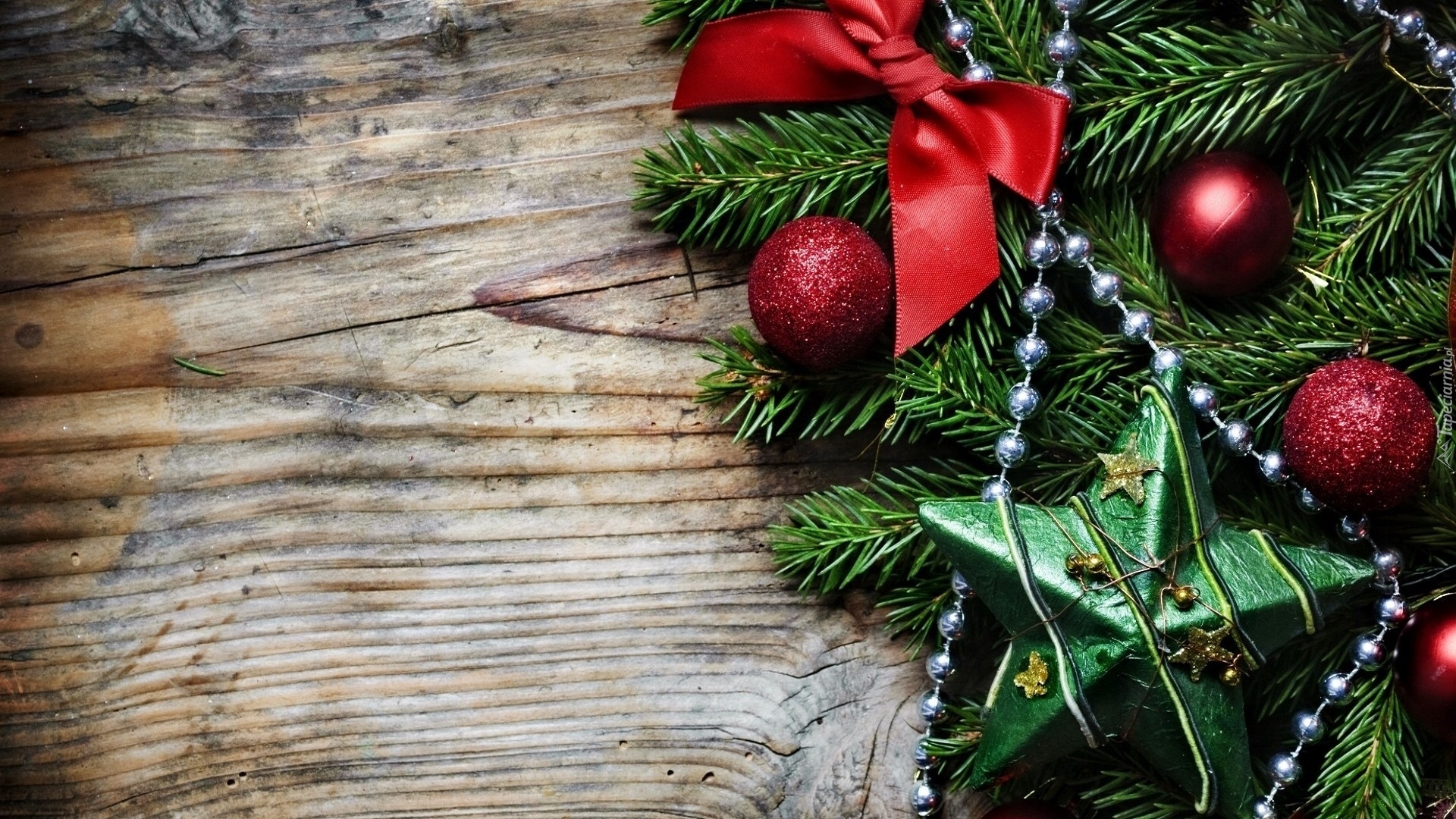 Edytor tapety: Gałązka świerku z bombkami, gwiazdą i kokardą