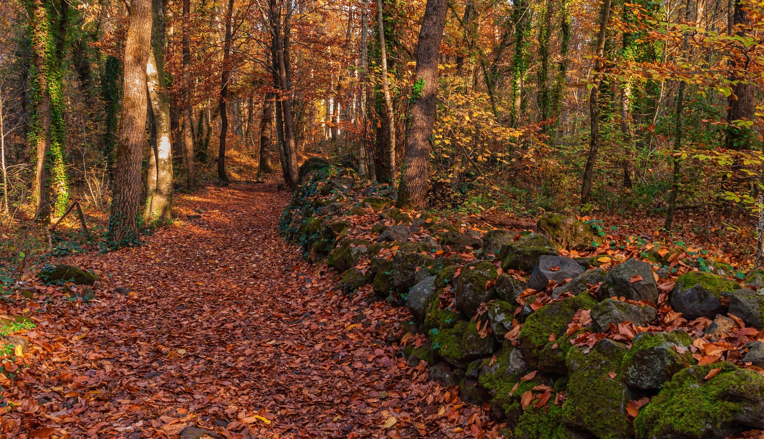 Edytor tapety: Leśna droga wzdłuż omszałych kamieni