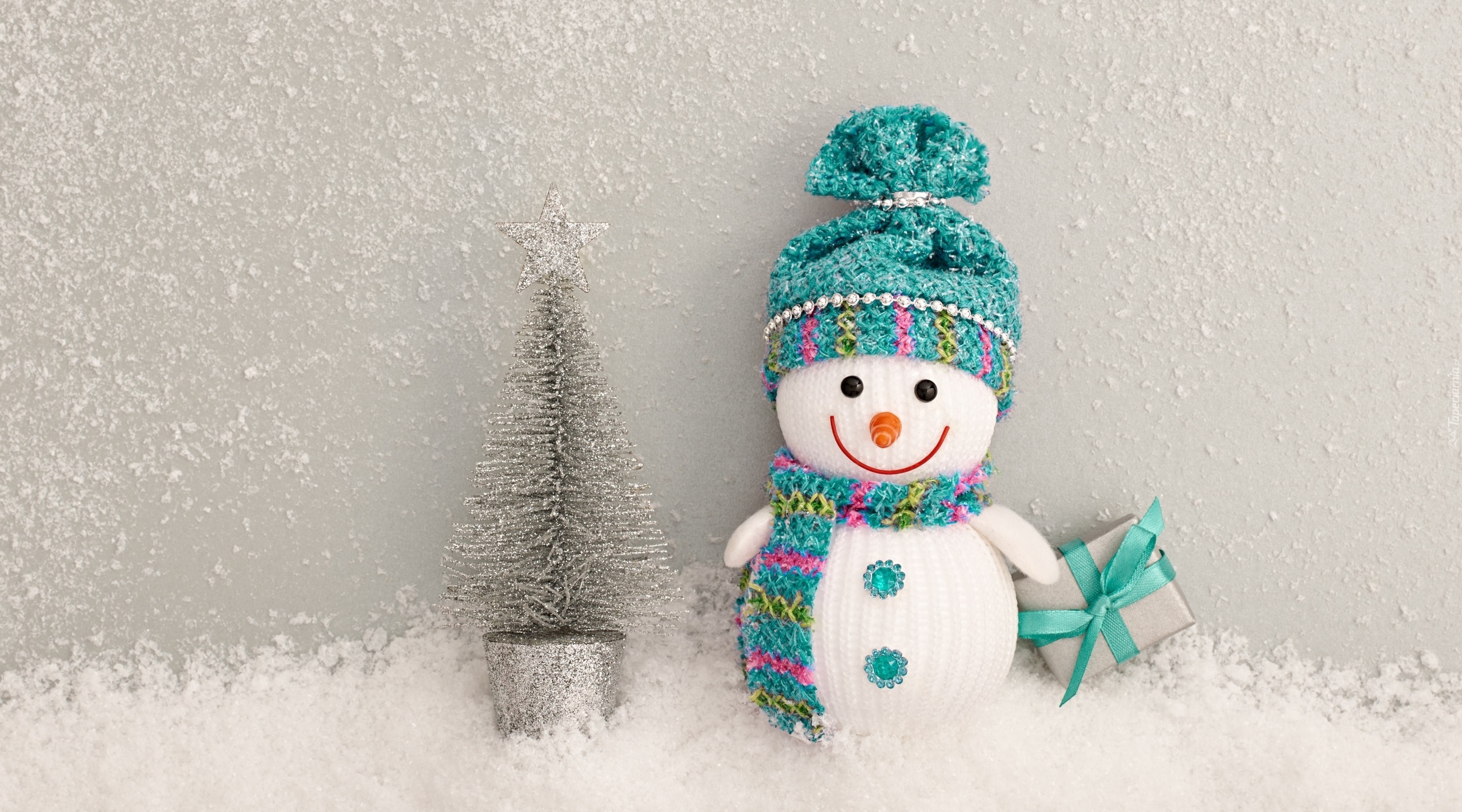 Edytor tapety: Bałwanek z prezentem obok choinki z gwiazdką