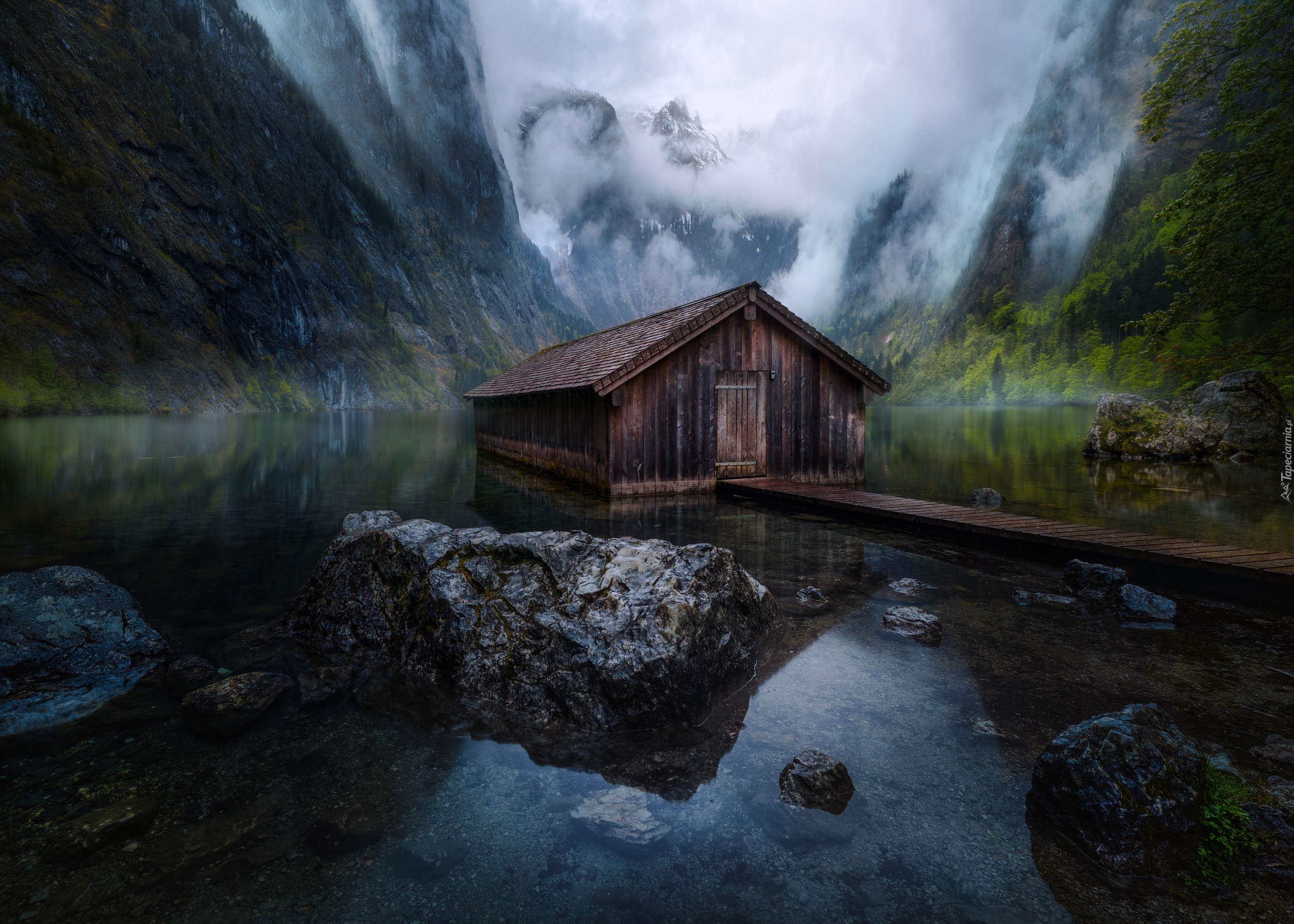 Edytor tapety: Drewniana chatka na jeziorze Königssee w Bawarii