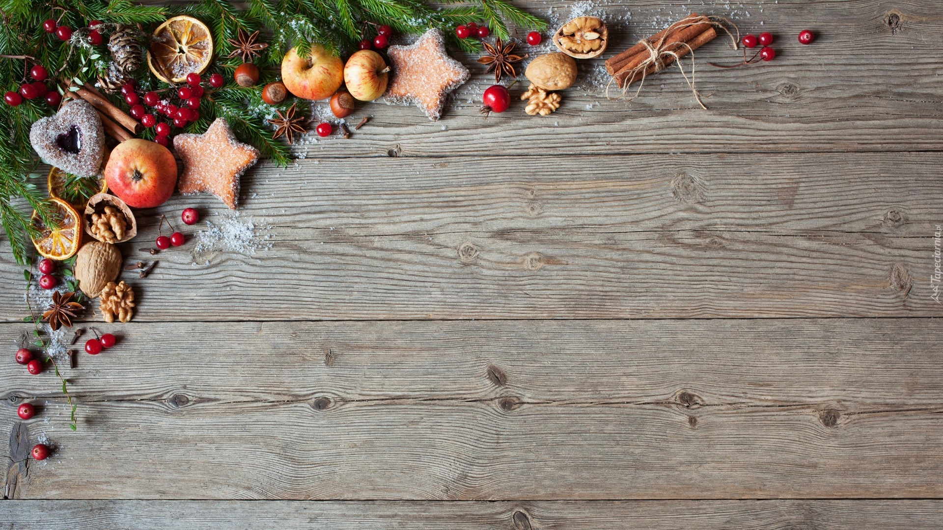 Edytor tapety: Ciasteczka, orzechy i jabłka w kompozycji świątecznej