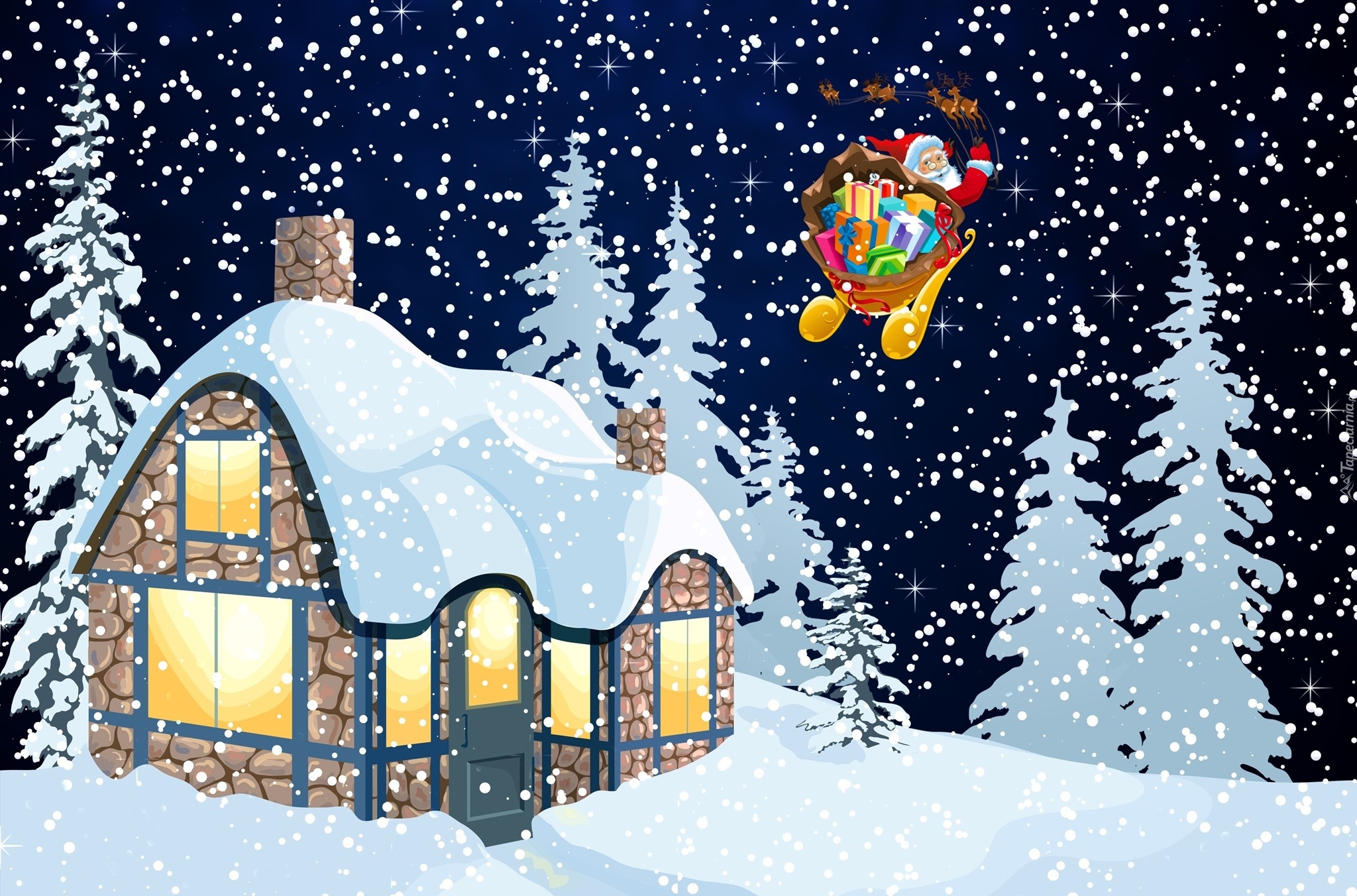Edytor tapety: Zaprzęg Mikołaja nad domkiem wśród drzew