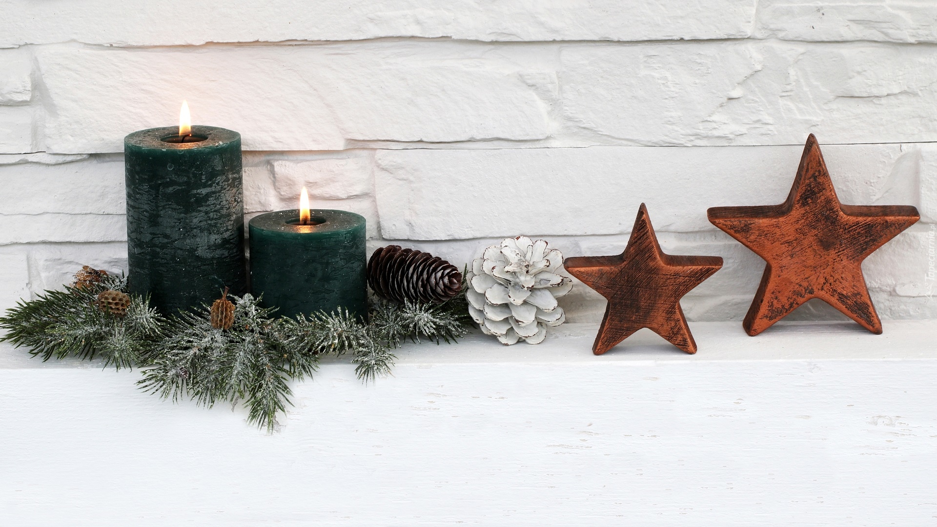 Edytor tapety: Stroik ze świecami i szyszkami obok gwiazdek