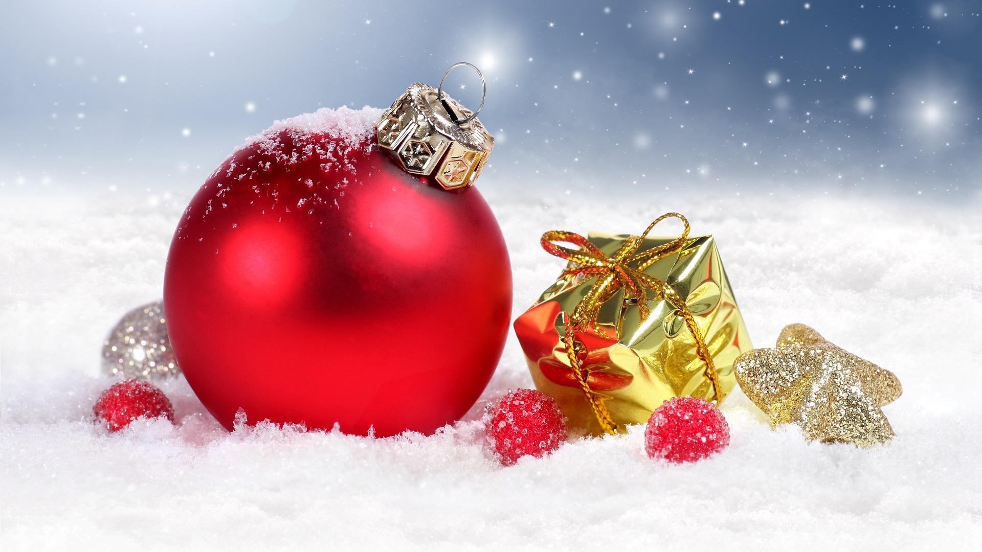 Edytor tapety: Czerwona bombka i prezent na śniegu