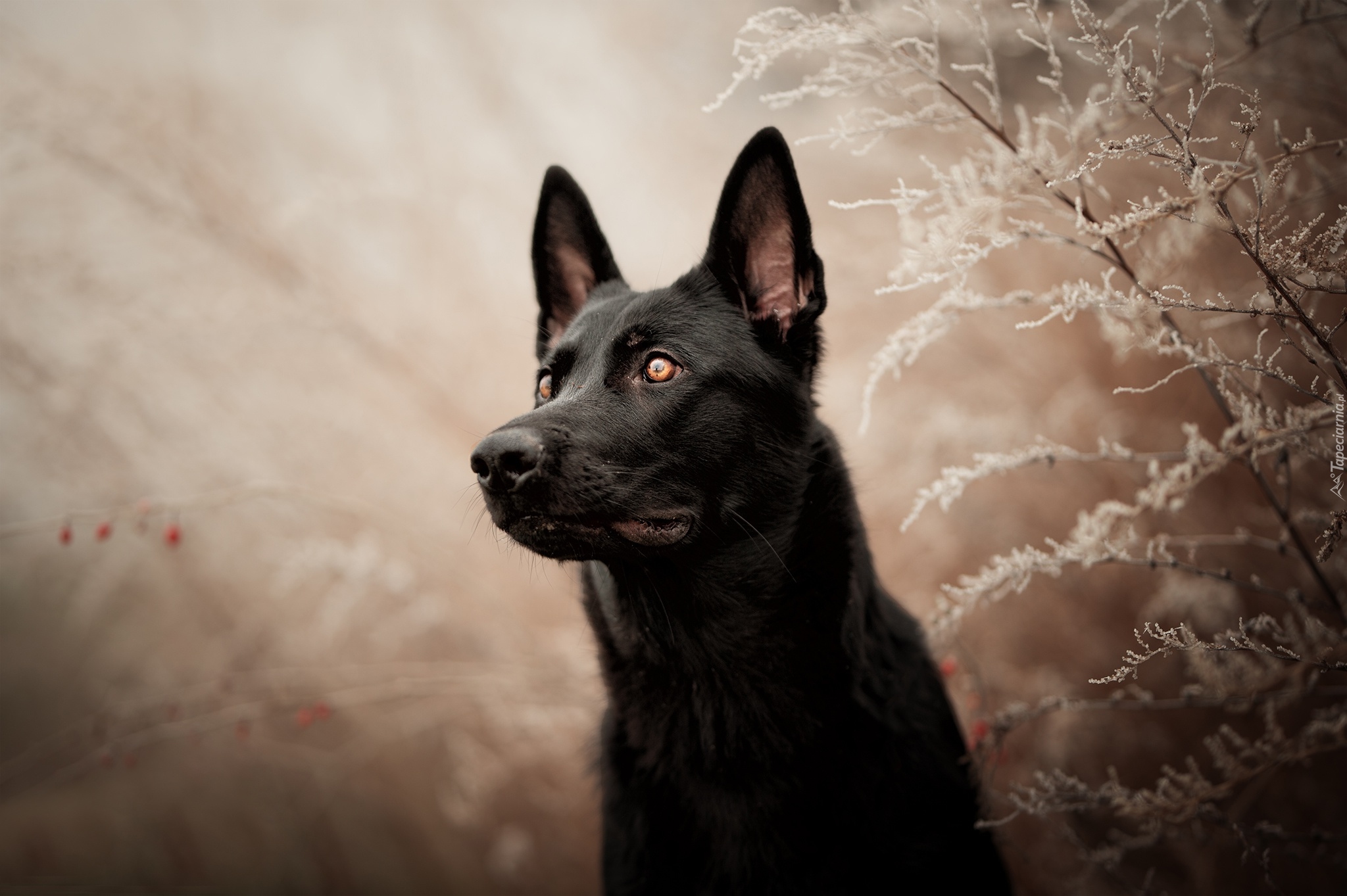 Edytor tapety: Czarny owczarek niemiecki wśród oszronionych roślin