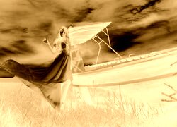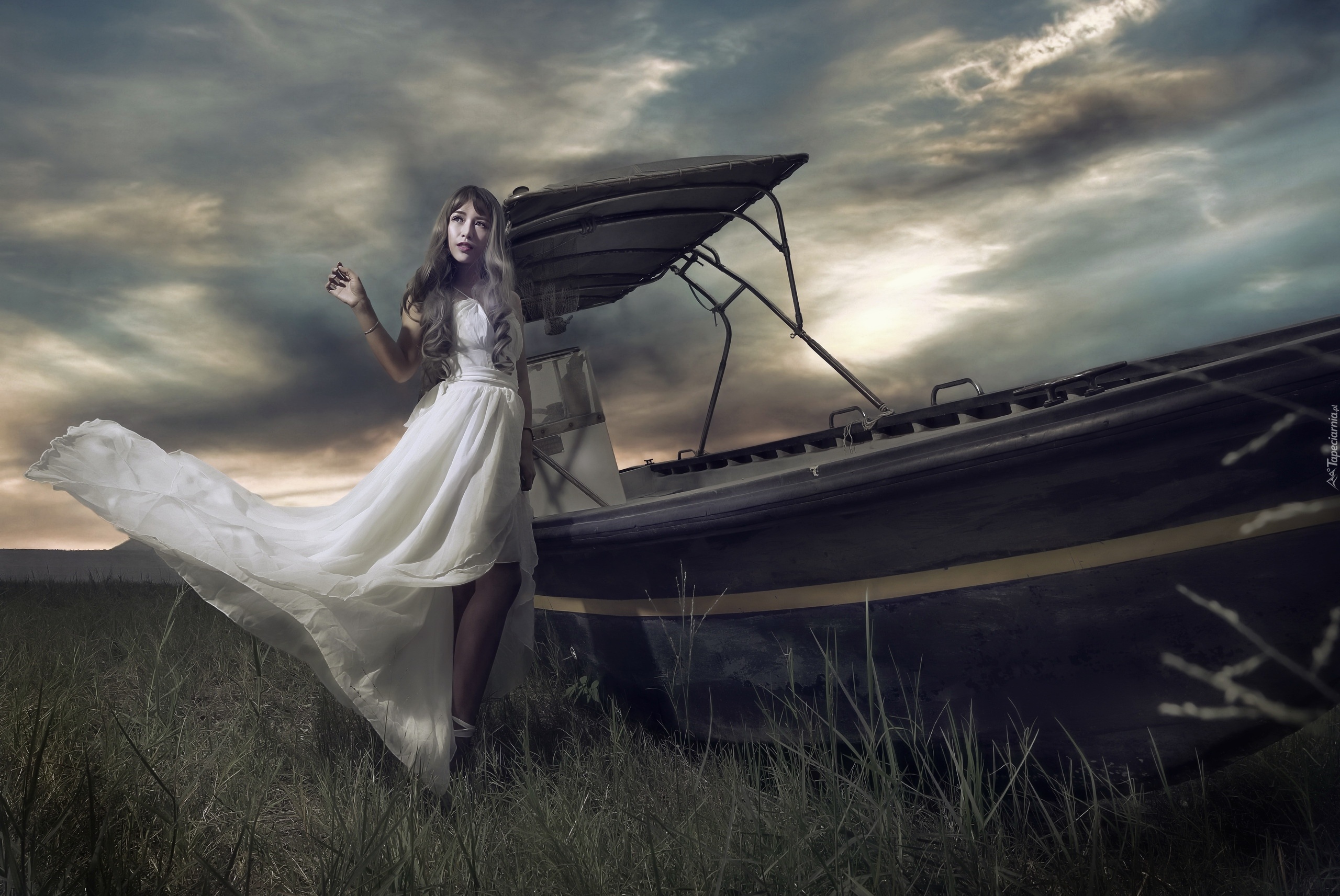 Edytor tapety: Kobieta w białej sukni przy łódce