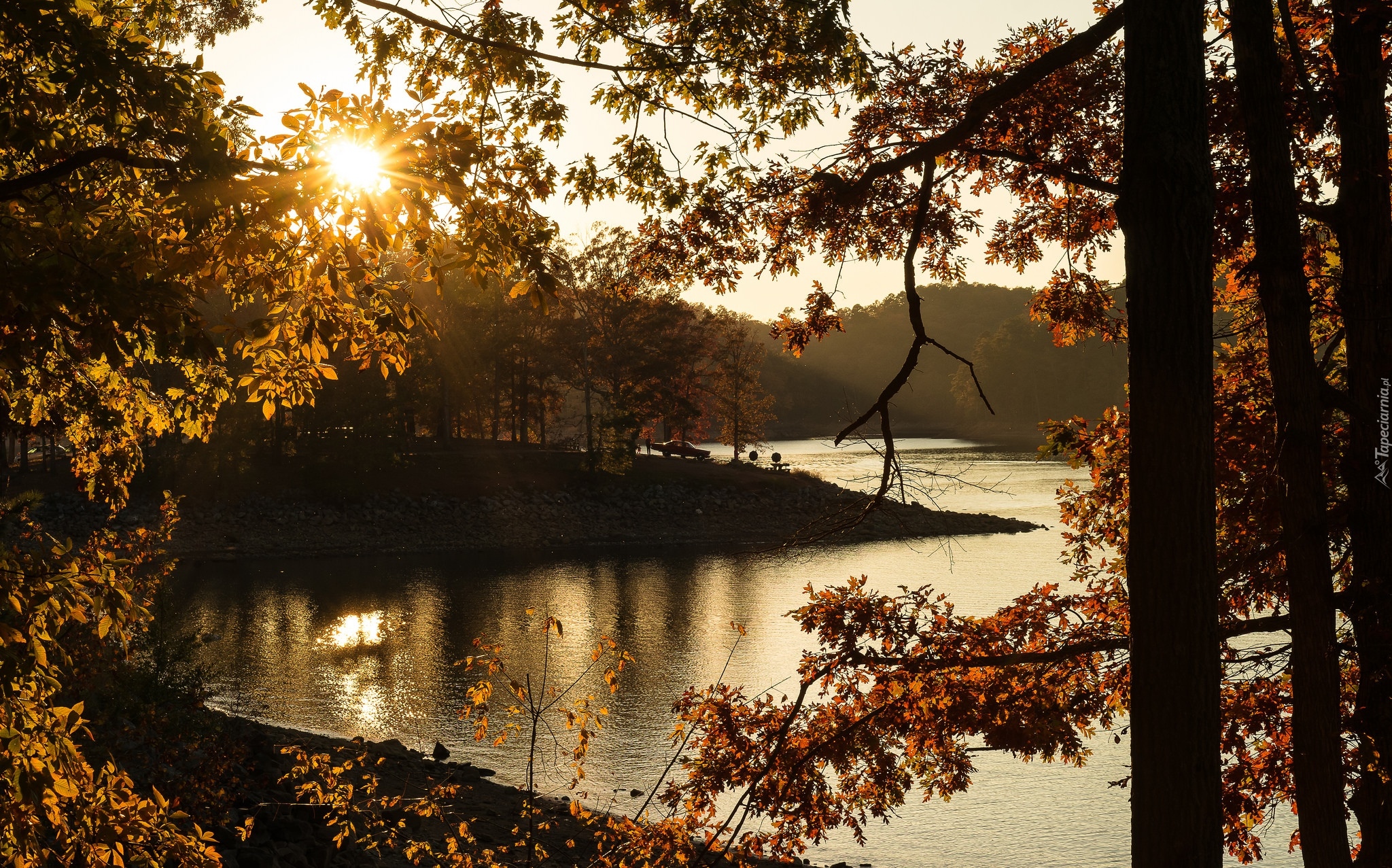 Edytor tapety: Jesienne drzewa nad rzeką w promieniach słońca