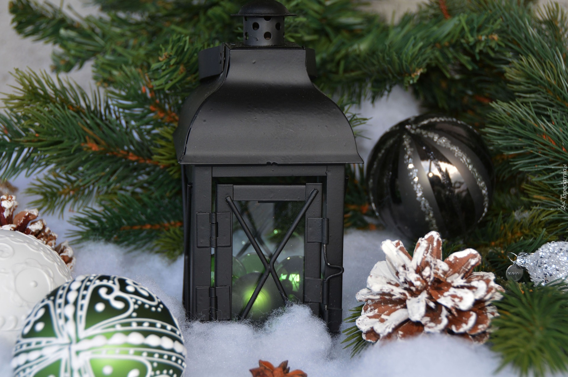 Edytor tapety: Lampion postawiony obok bombek i świerkowych gałązek