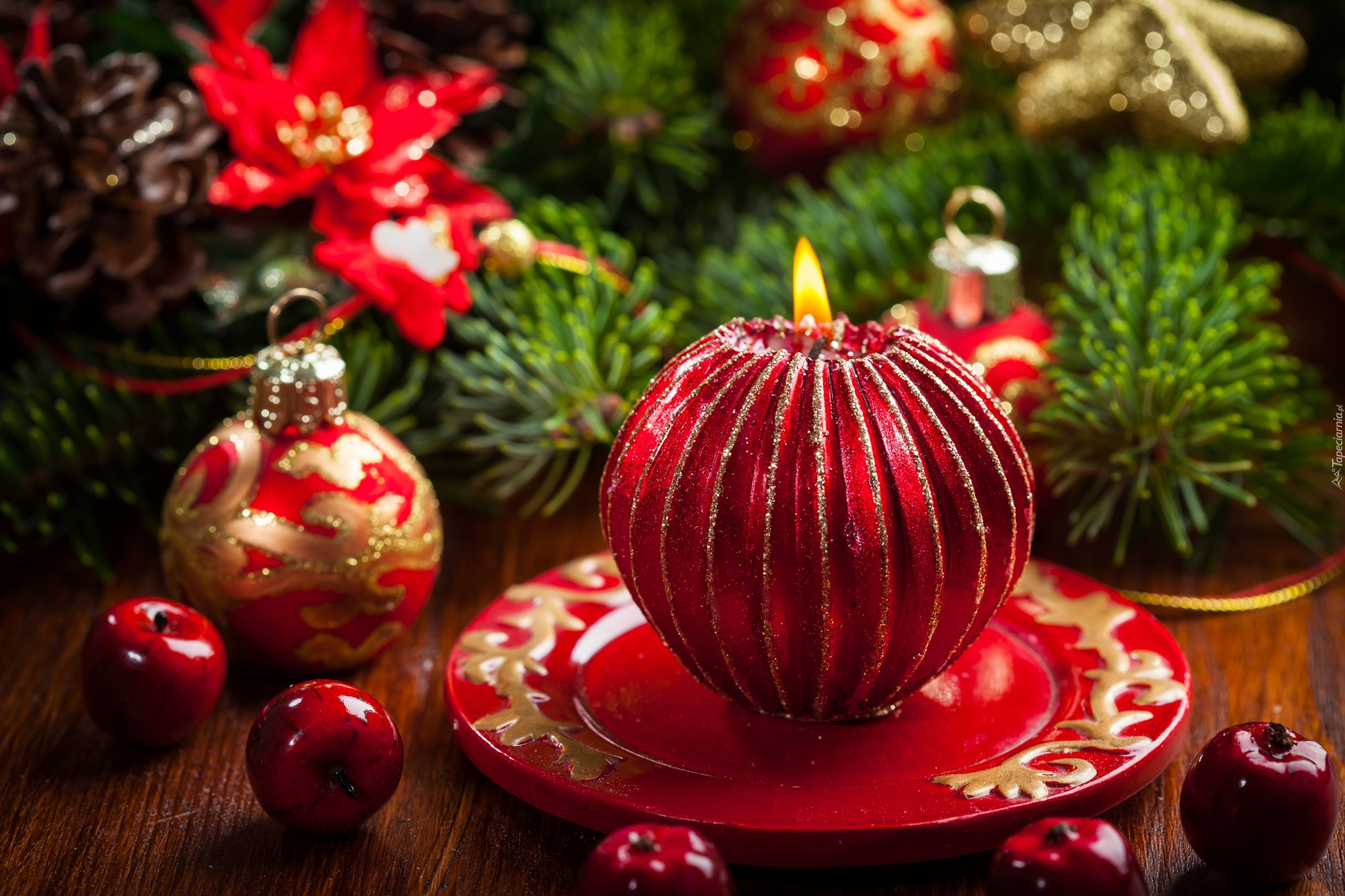 Edytor tapety: Świeca na talerzu obok świątecznych ozdób i gałązek