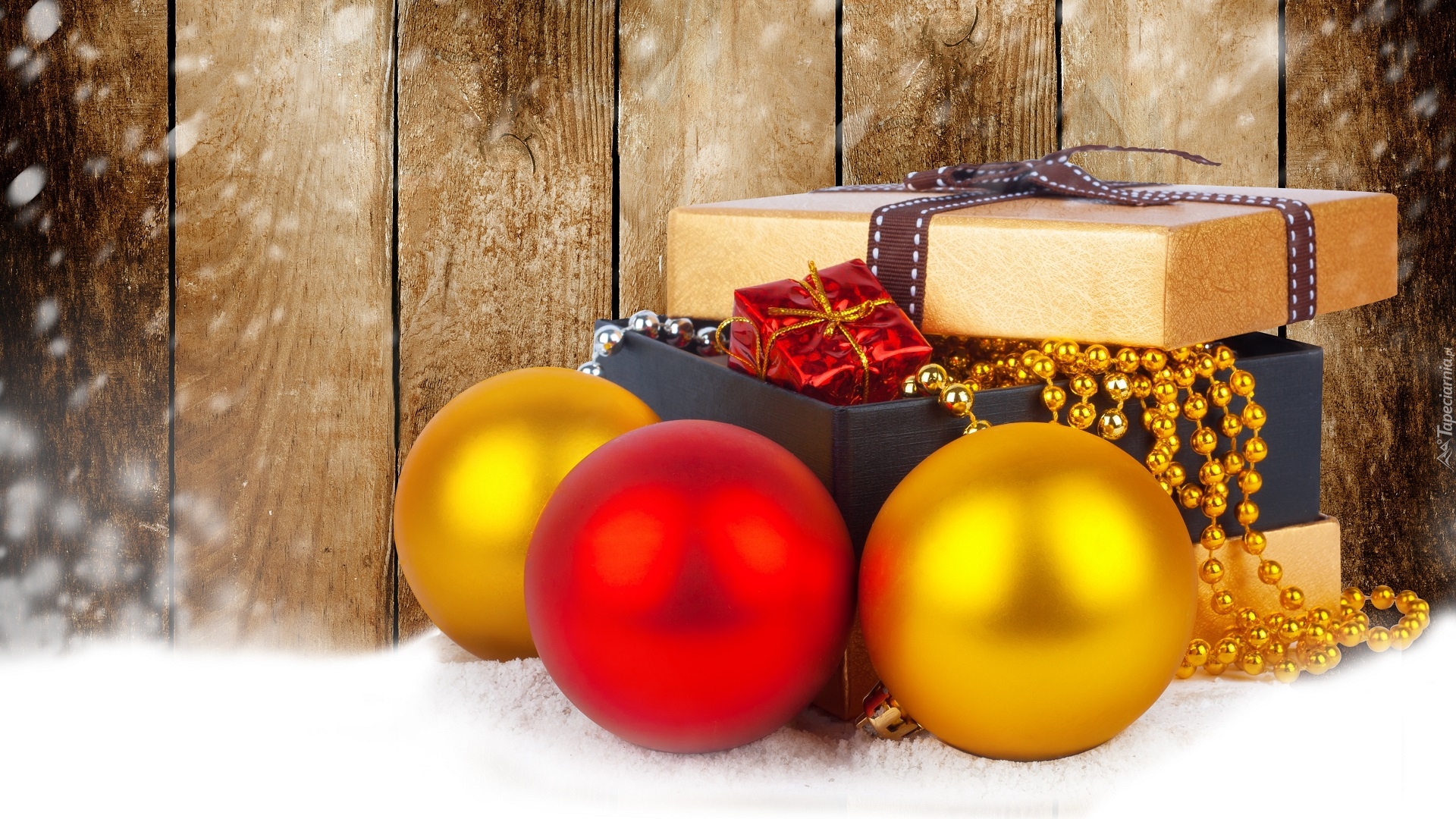 Edytor tapety: Bombki obok pudełka z koralikami i prezentem
