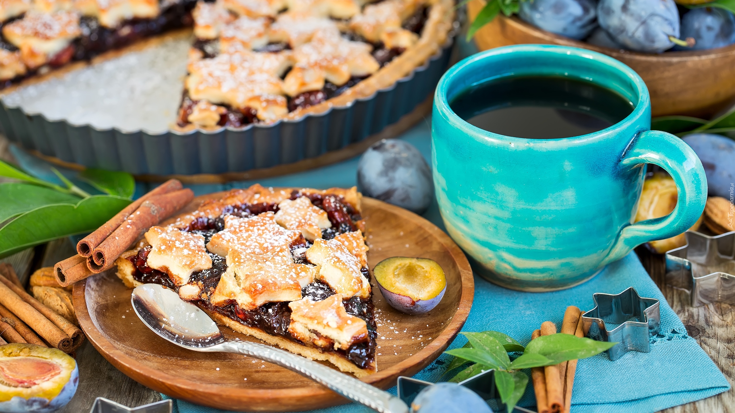 Edytor tapety: Ciasto śliwkowe na talerzyku obok kubka kawy
