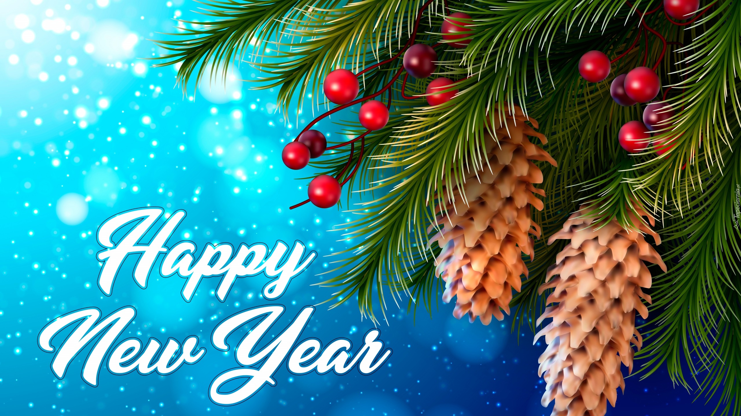 Edytor tapety: Noworoczne życzenia obok gałązki z szyszkami