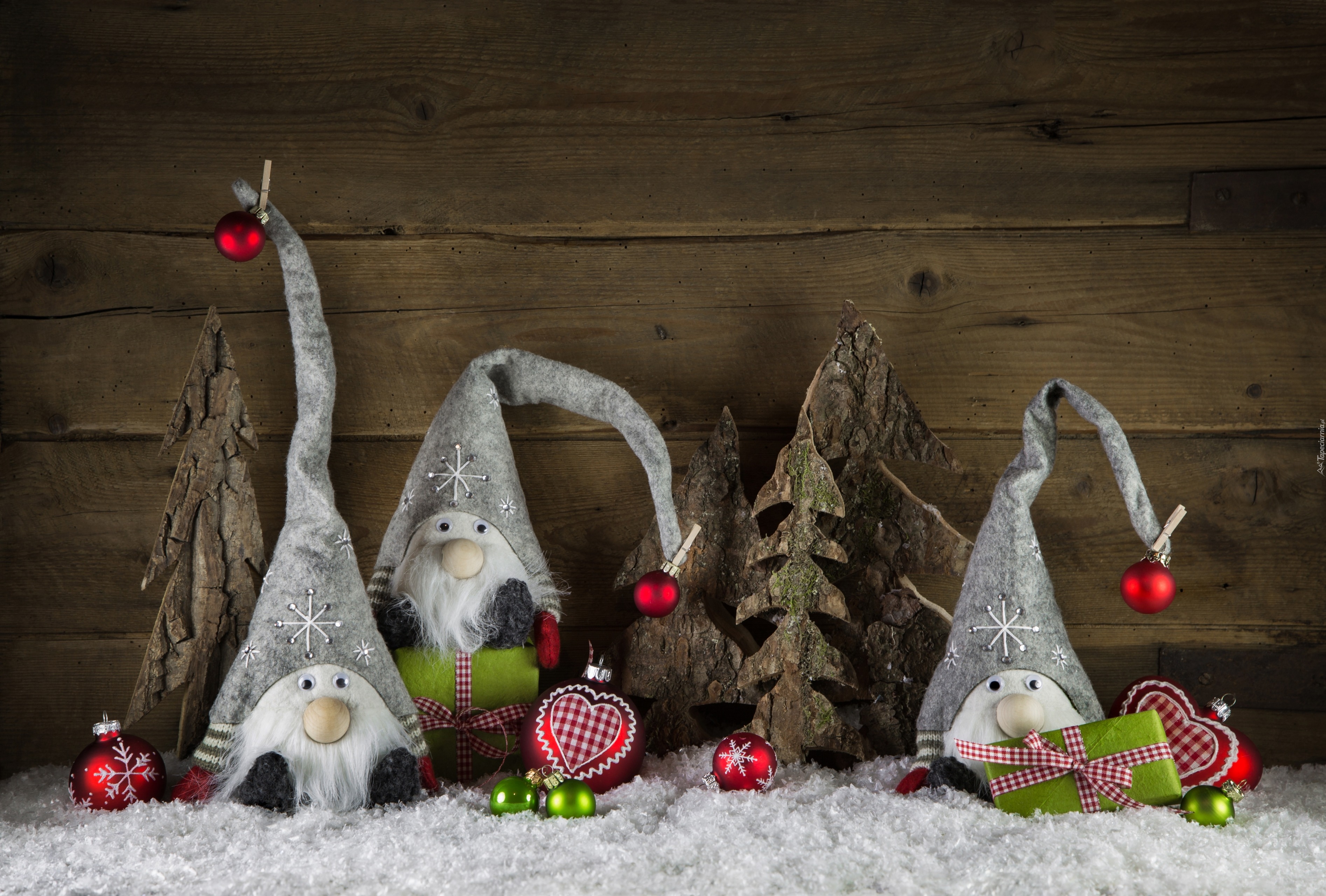 Edytor tapety: Gałgankowe skrzaty przy choinkach i bombkach na śniegu