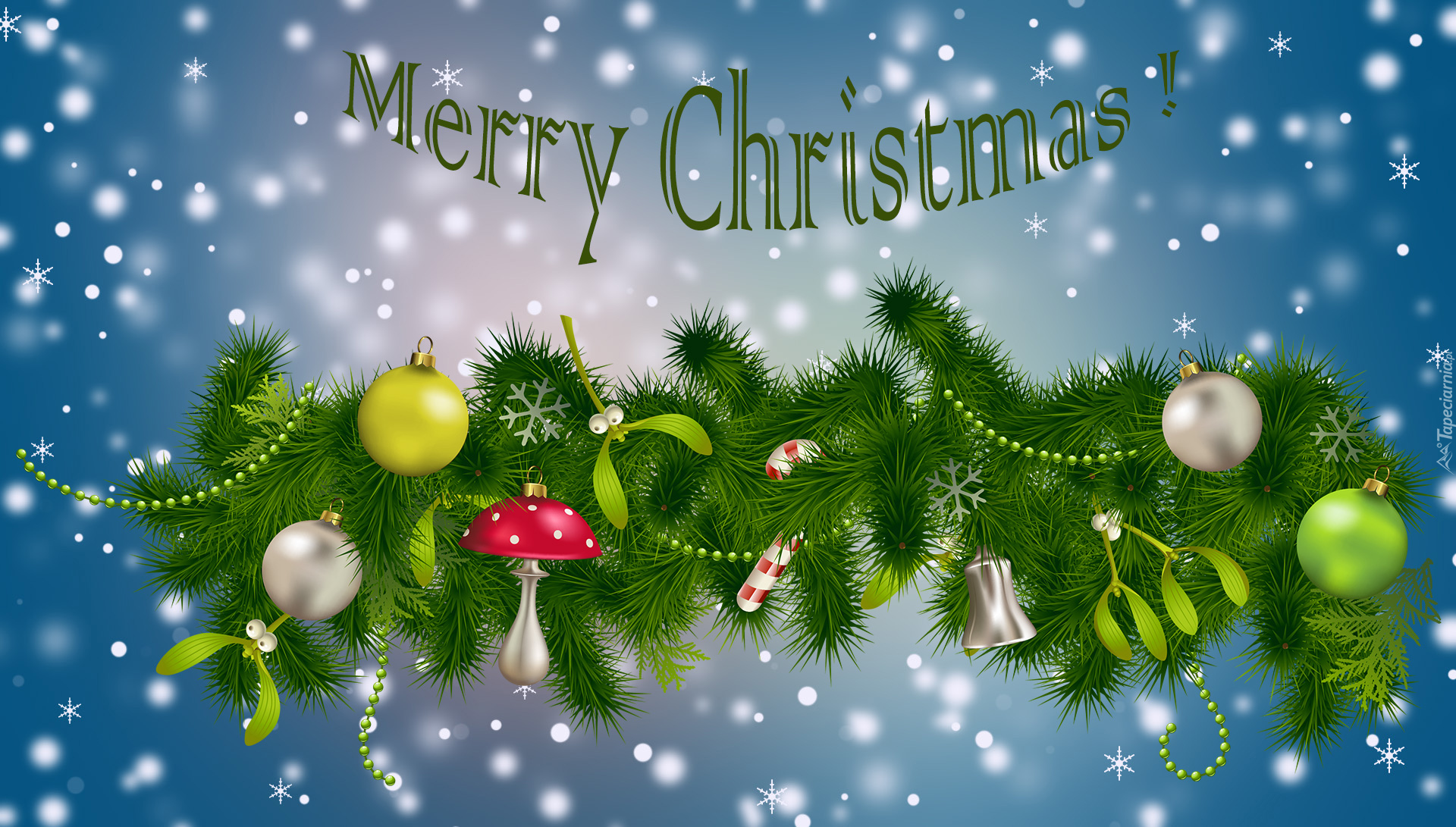 Edytor tapety: Świąteczne życzenia nad gałązką z ozdobami