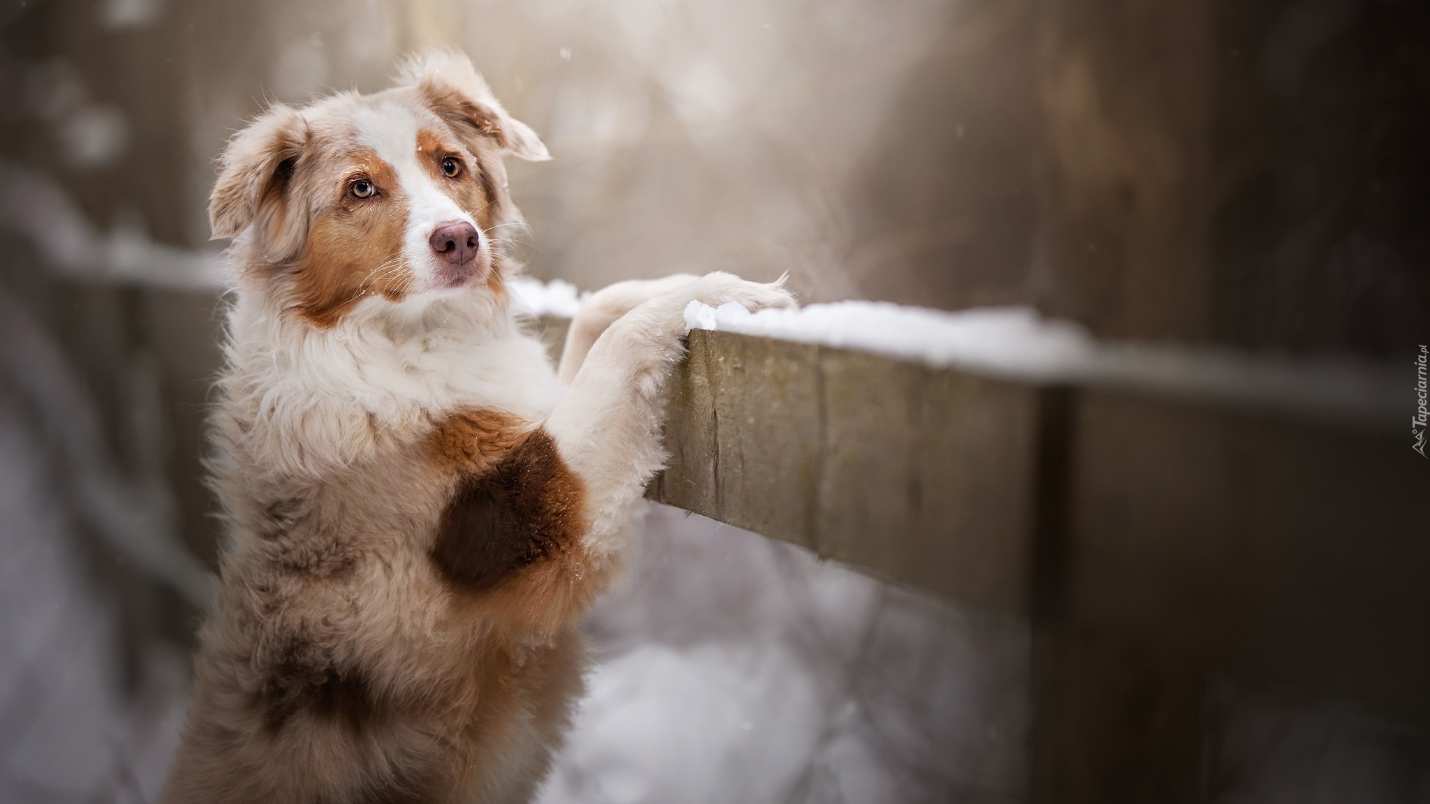 Edytor tapety: Owczarek australijski oparty łapkami o płot