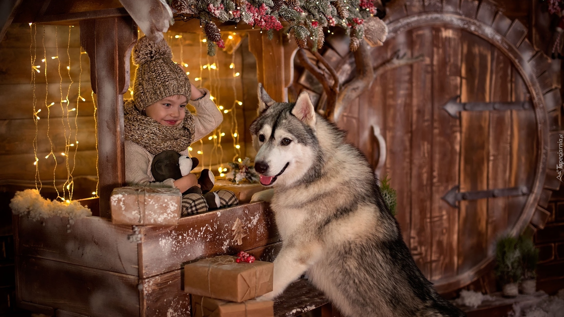 Edytor tapety: Husky obok dziewczynki z misiem pilnuje prezentów