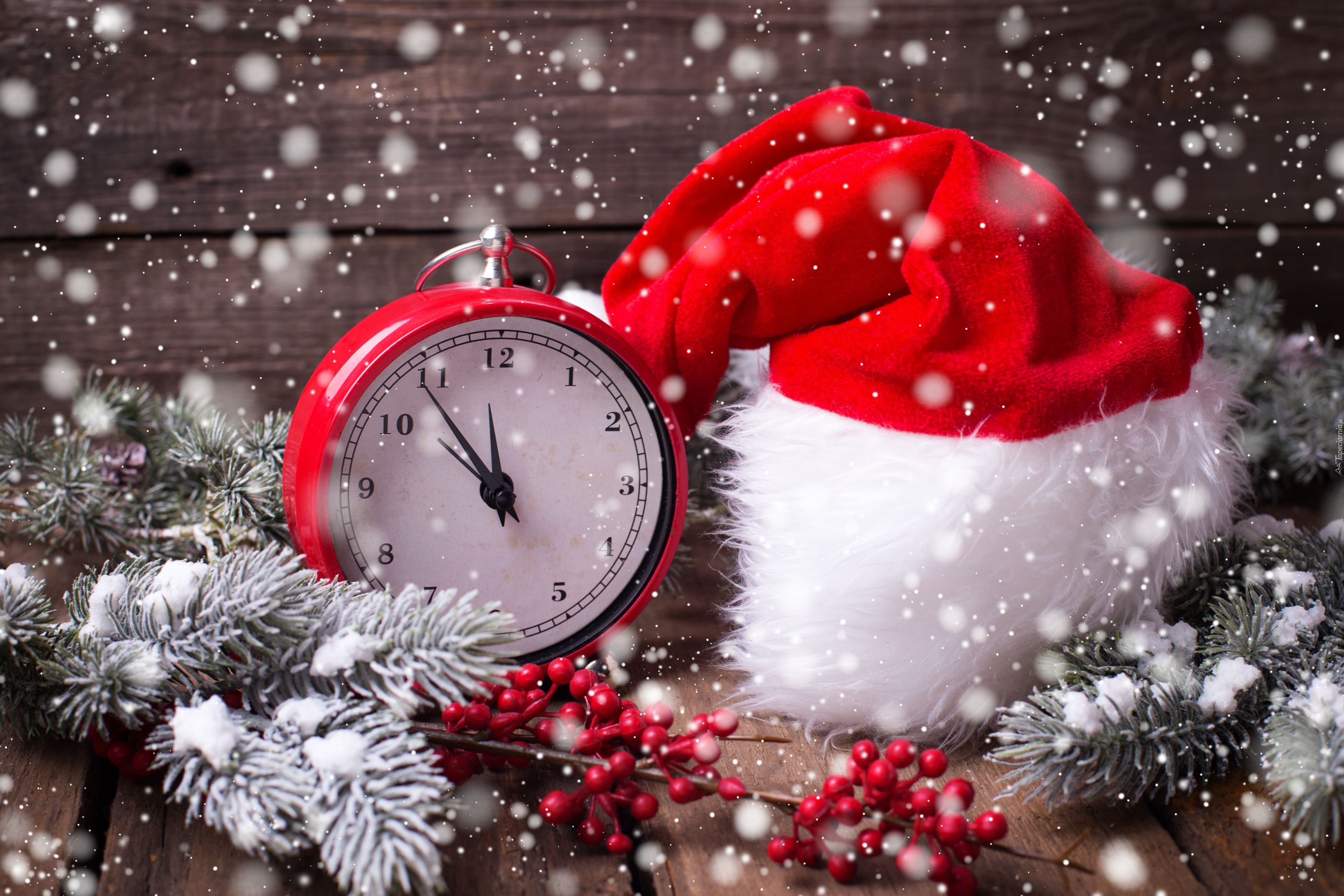 Edytor tapety: Zegar i czapka Mikołaja w świątecznej kompozycji