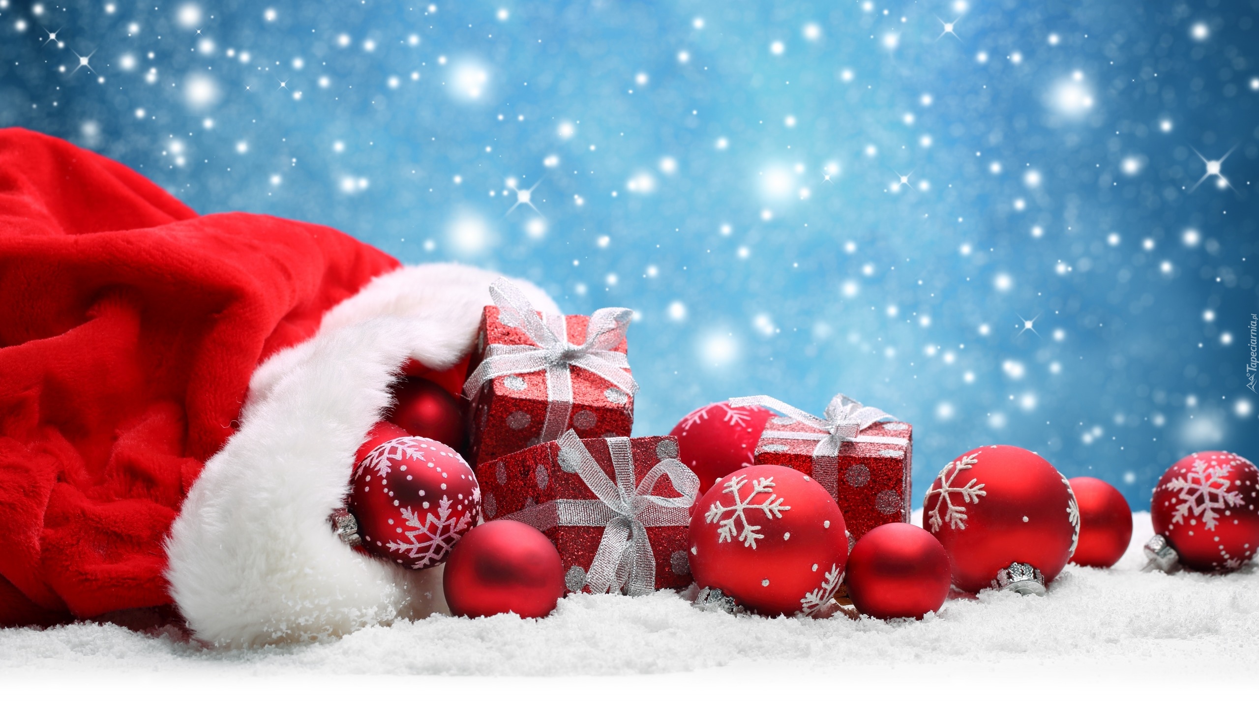 Edytor tapety: Wysypane z worka bombki i prezenty na śniegu