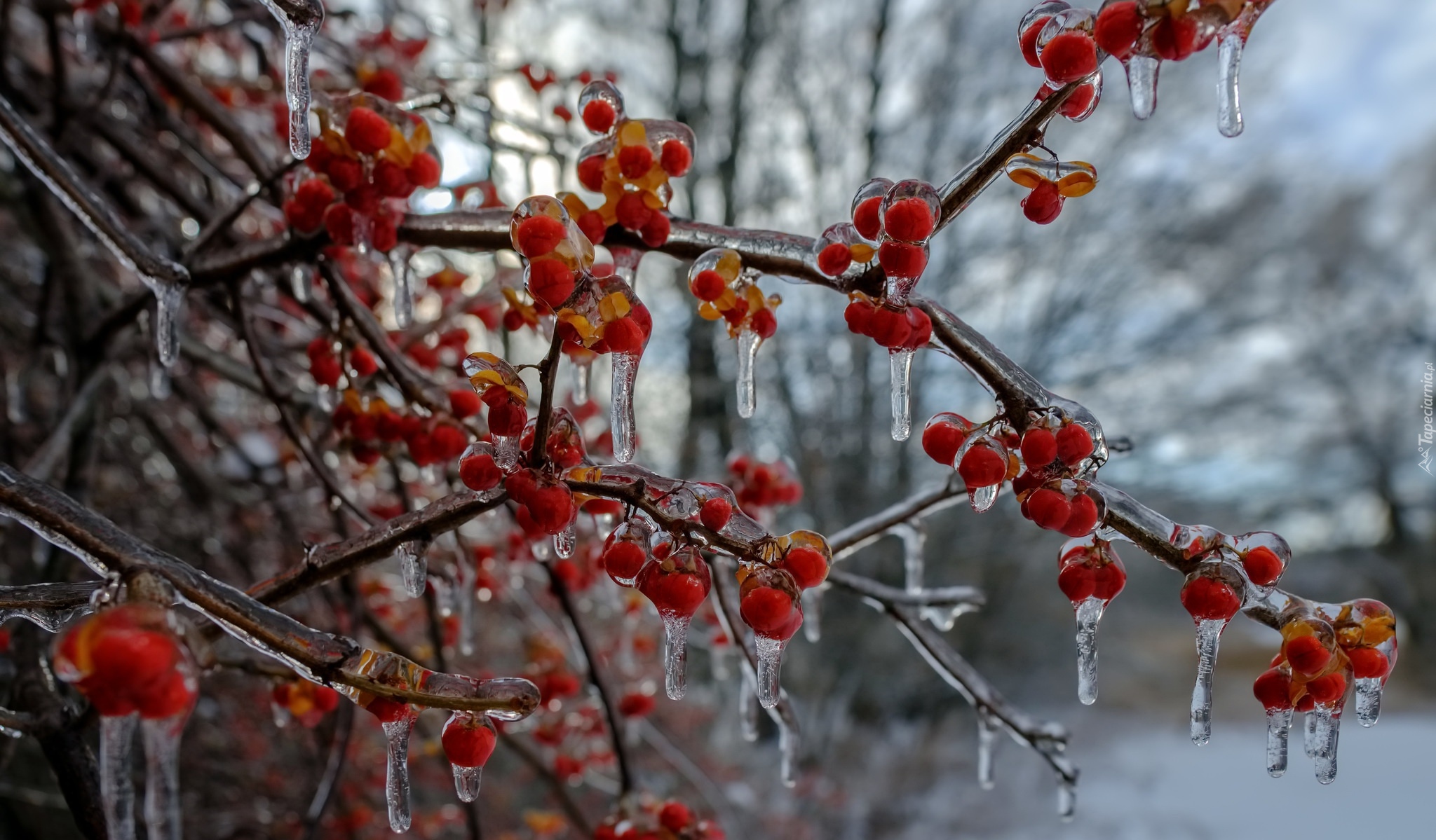 Edytor tapety: Oblodzone czerwone owoce na gałązkach