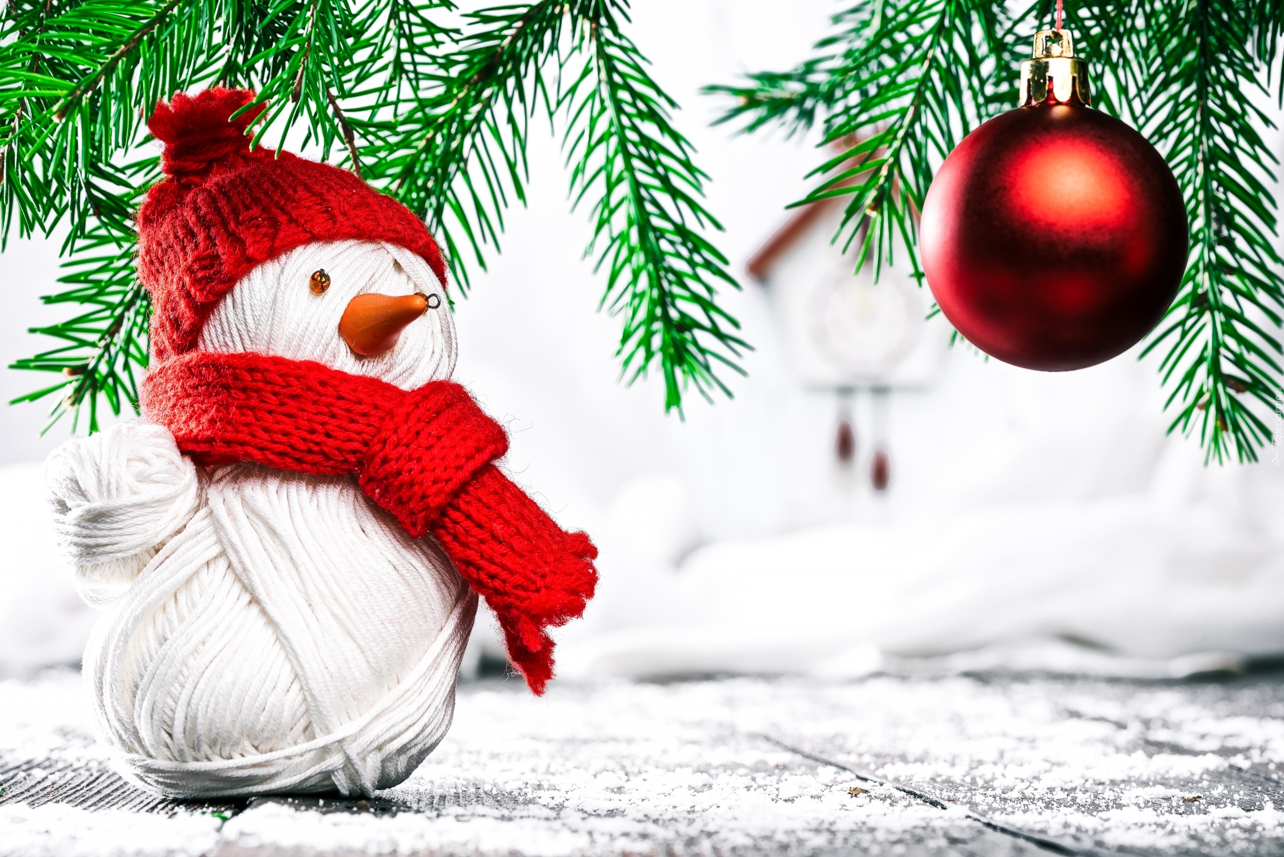 Edytor tapety: Bałwanek z włóczki obok gałązki z bombką