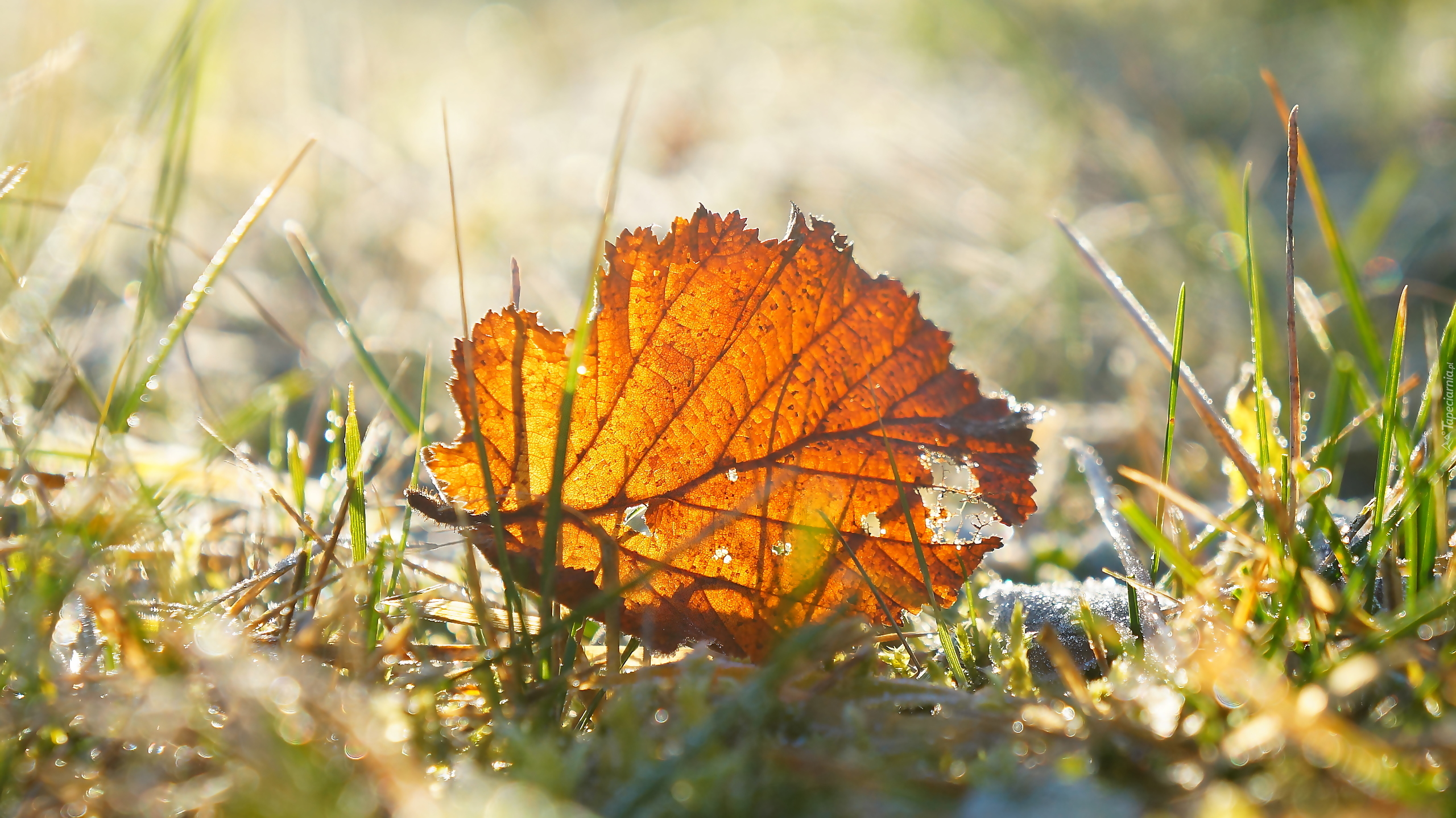 Edytor tapety: Jesienny liść upadł w trawę