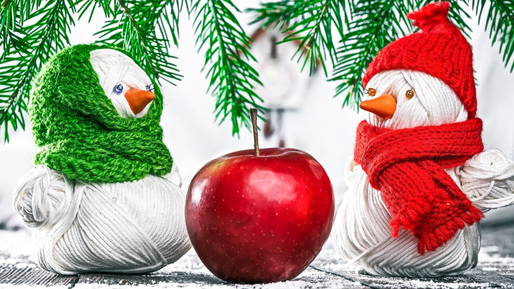 Edytor tapety: Włóczkowe bałwanki i jabłko