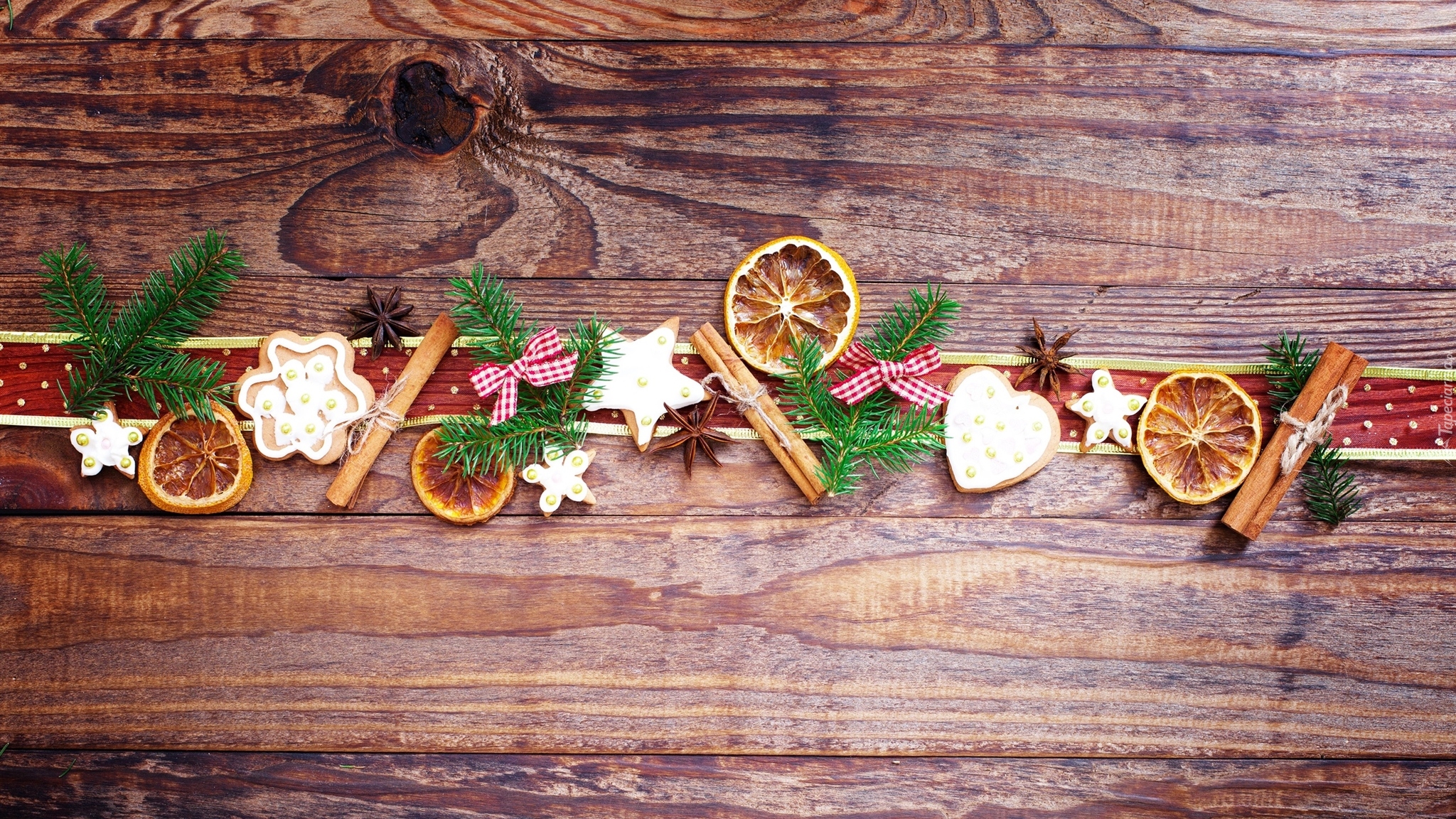 Edytor tapety: Ciasteczka świąteczne w dekoracji ułożone na deskach