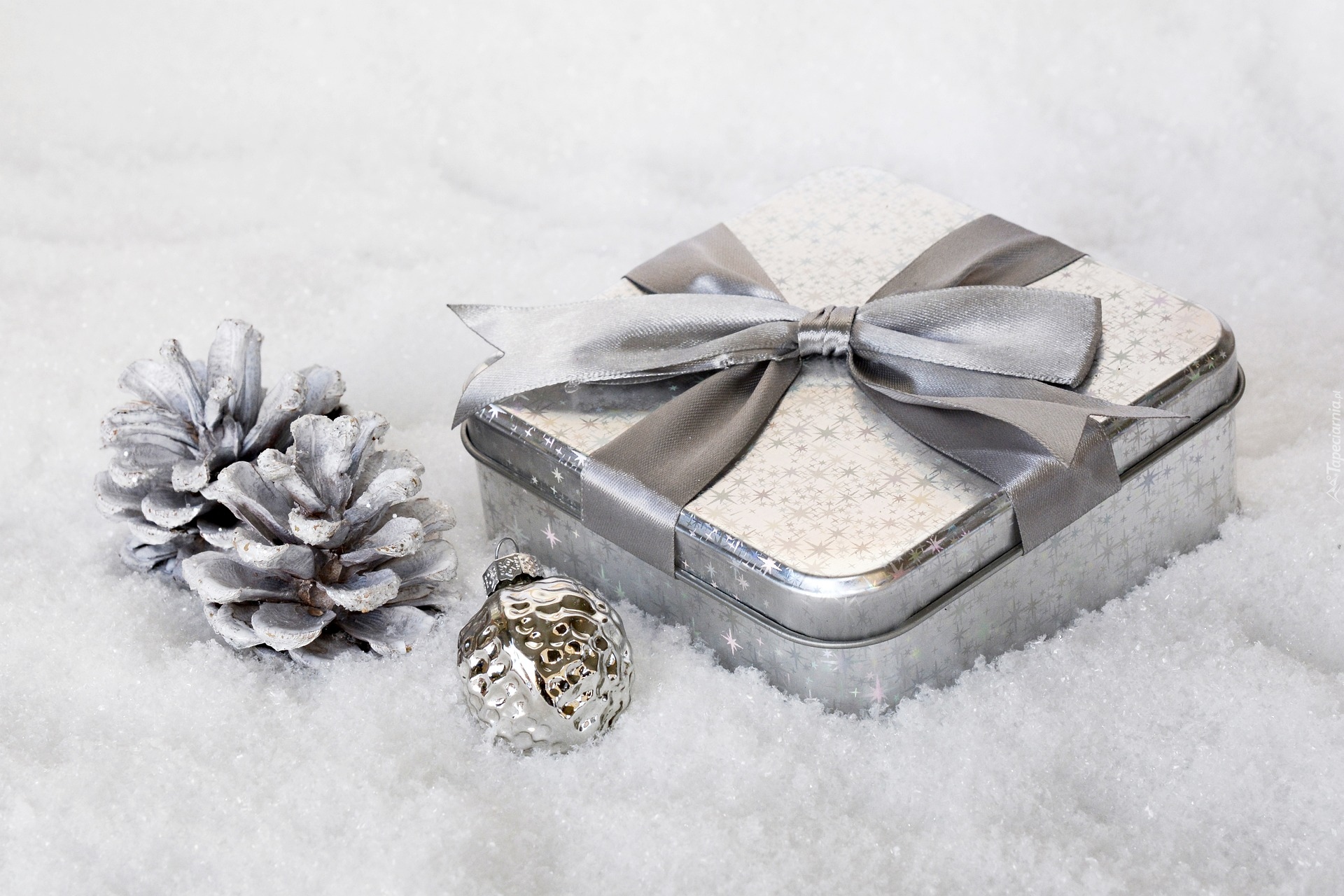 Edytor tapety: Srebrny prezent z szyszkami i bombką w śniegu