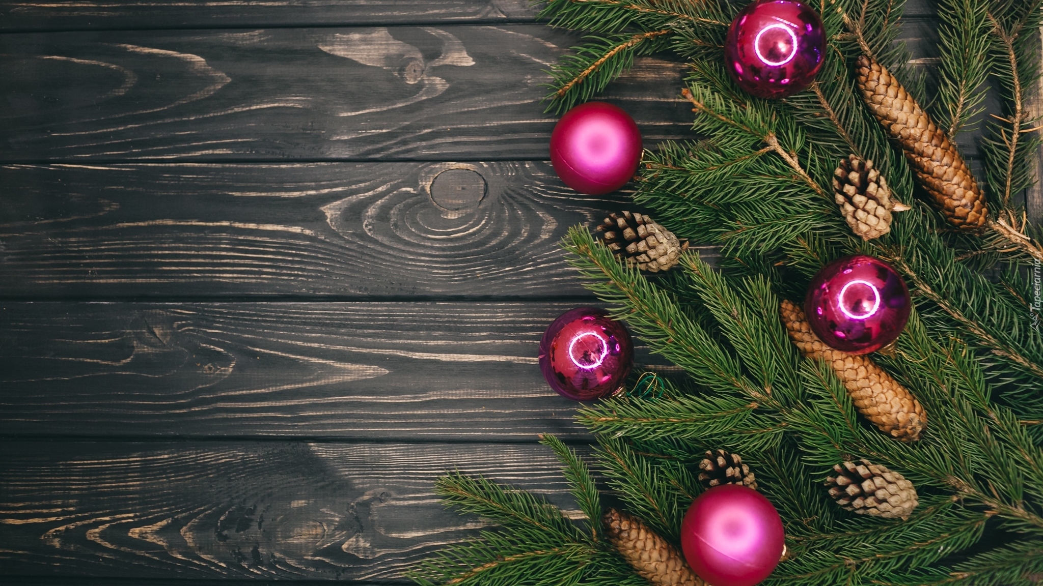 Edytor tapety: Bombki pomiędzy sosnowymi gałązkami ułożone na deskach