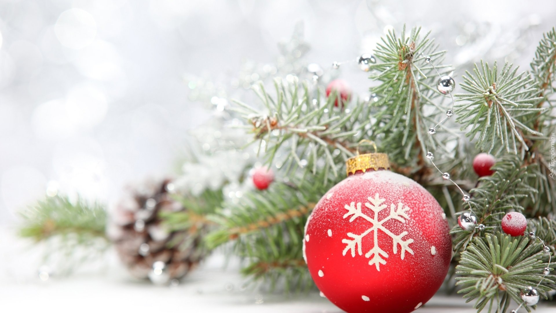 Edytor tapety: Czerwona bombka że śnieżynką przy gałązkach
