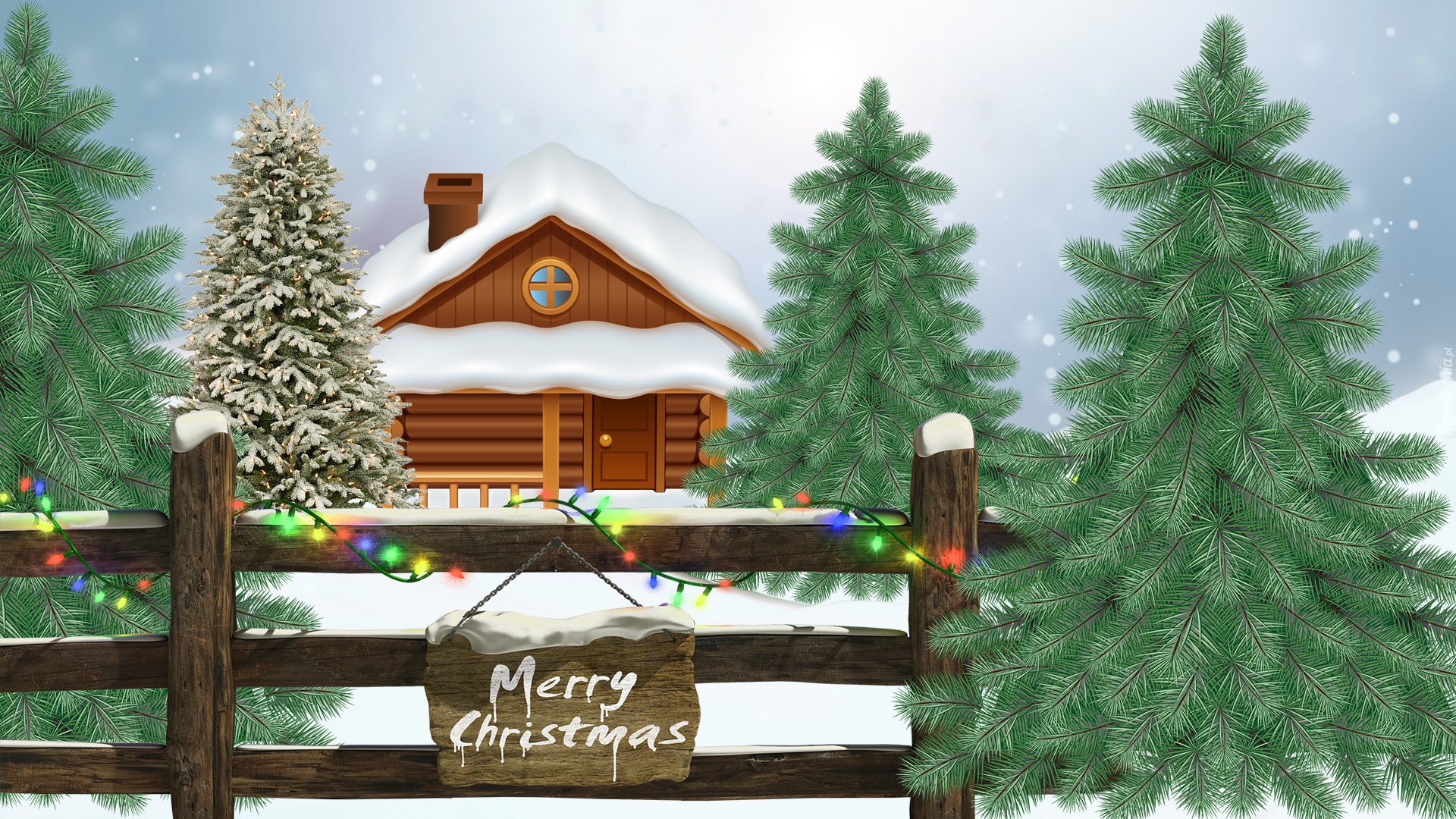 Edytor tapety: Świątecznie oświetlony płot i choinki przed domem