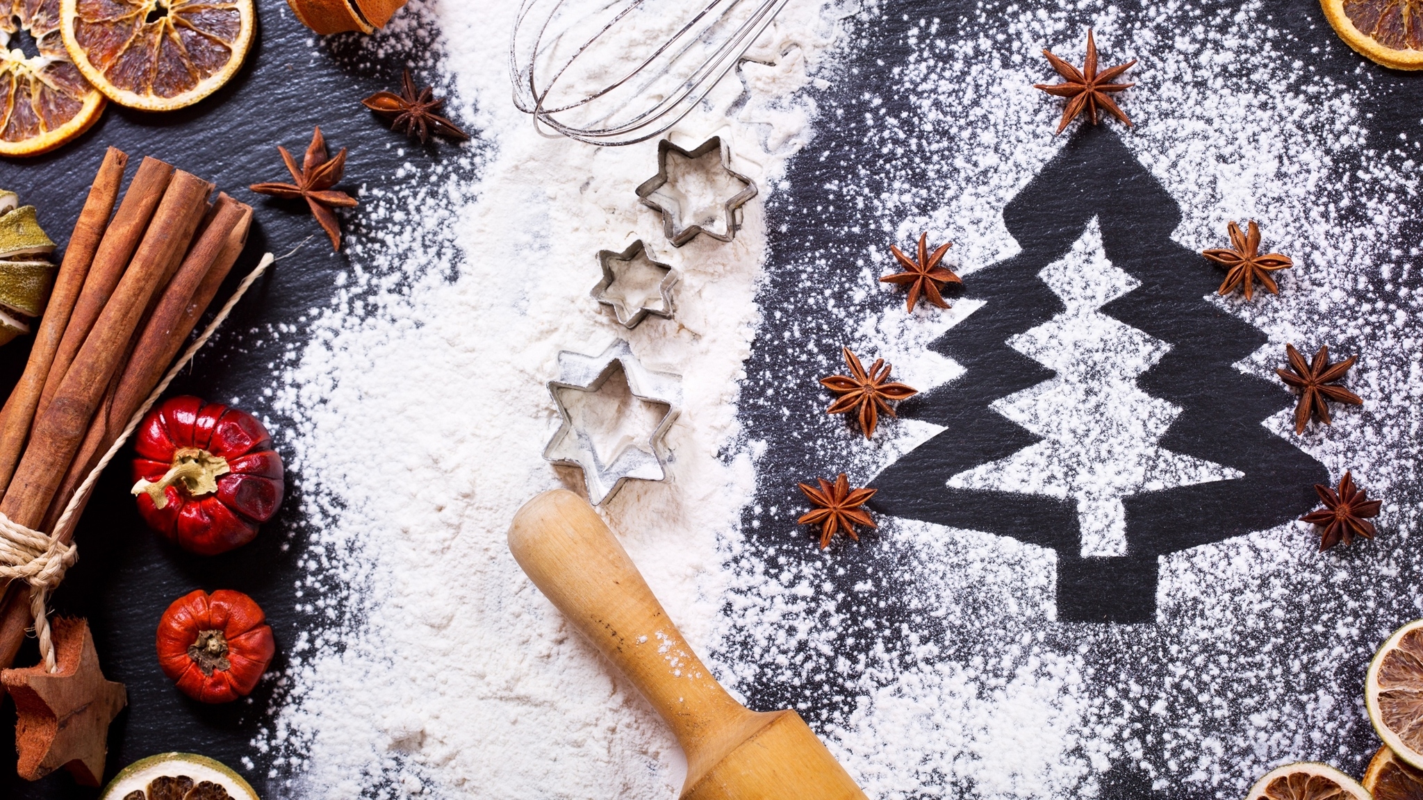 Edytor tapety: Foremki do ciasteczek obok choinki usypanej z mąki