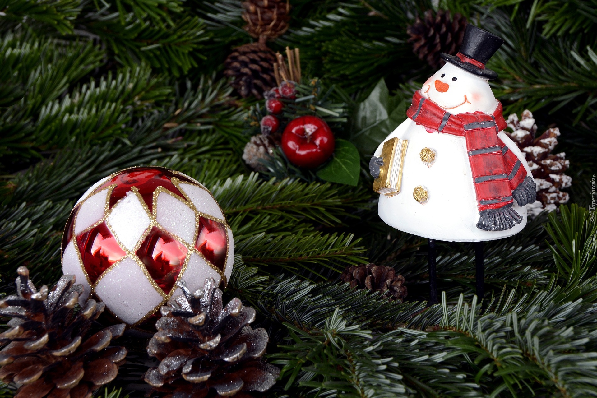 Edytor tapety: Bałwanek obok bombki na gałązkach świerku