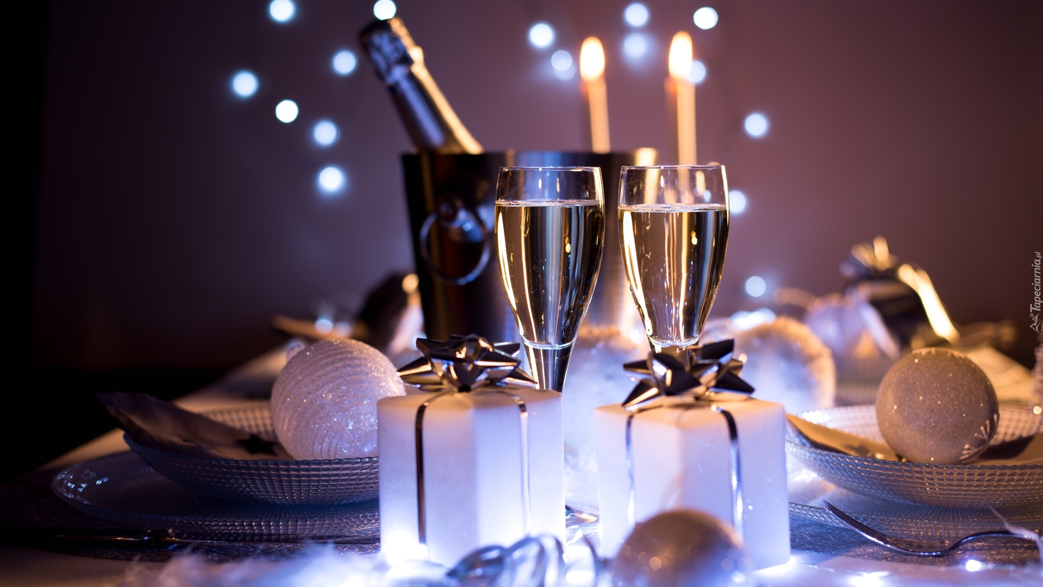 Edytor tapety: Kieliszki z szampanem obok prezentów sylwestrowych